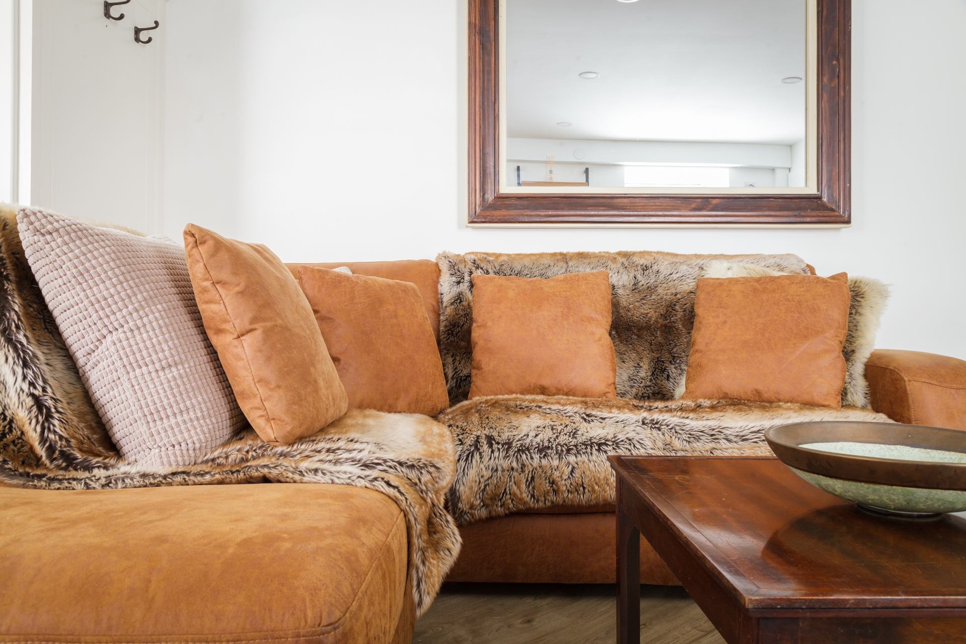 Living Area: Large L-shaped sofa, TV and a coffee table.