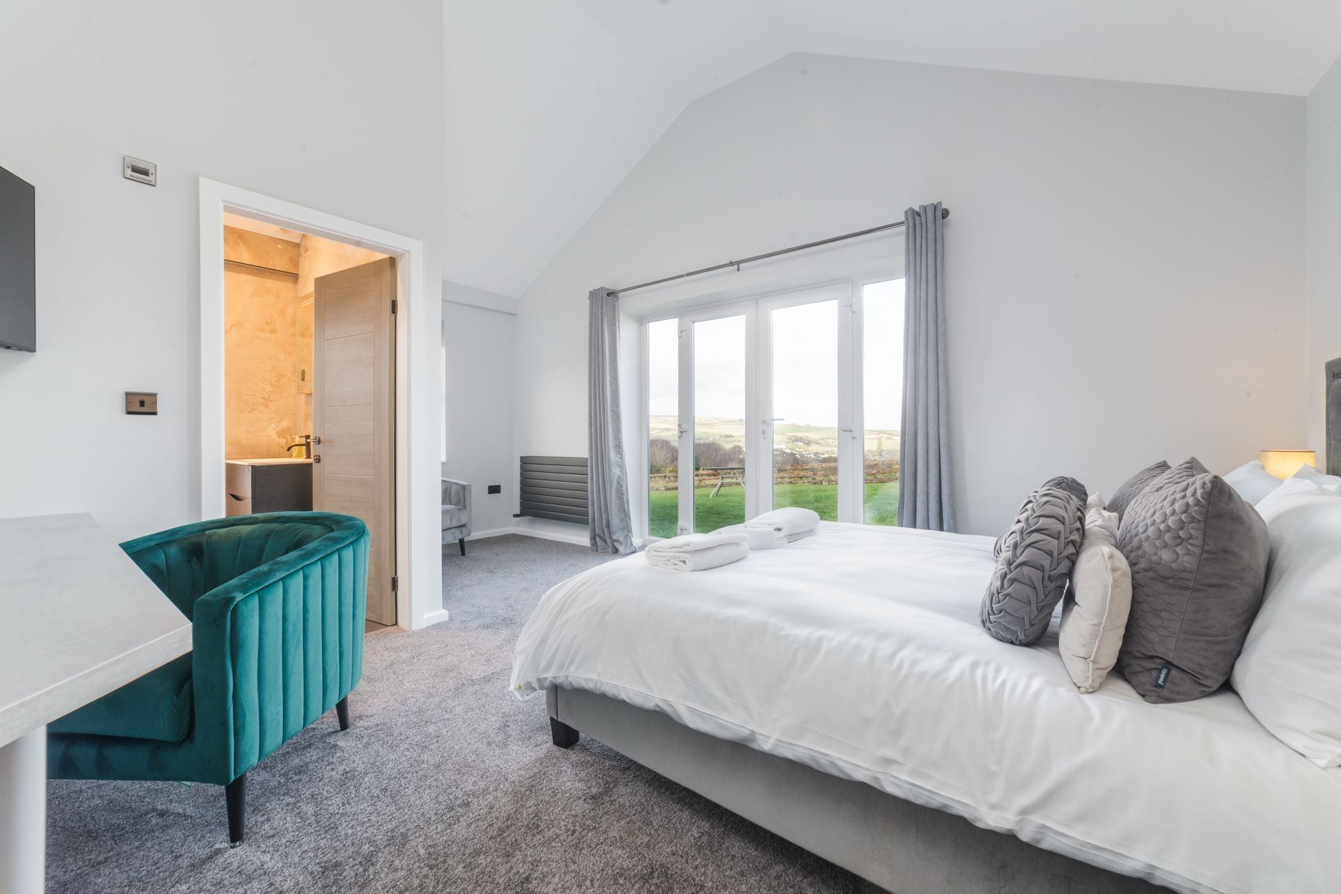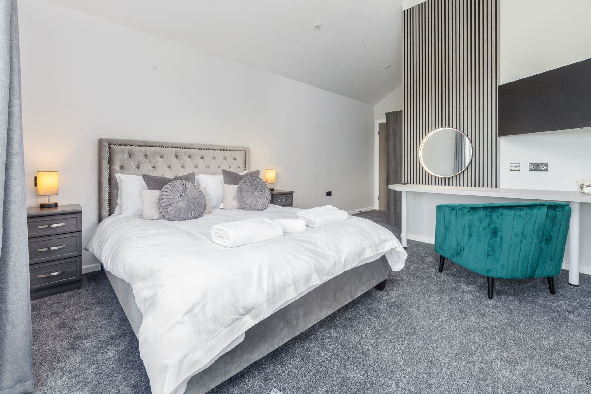 Bedroom 1: King size bed, bedside tables, wardrobe, dressing table with vanity mirror, Smart TV. Sea views and access to garden area through French doors.