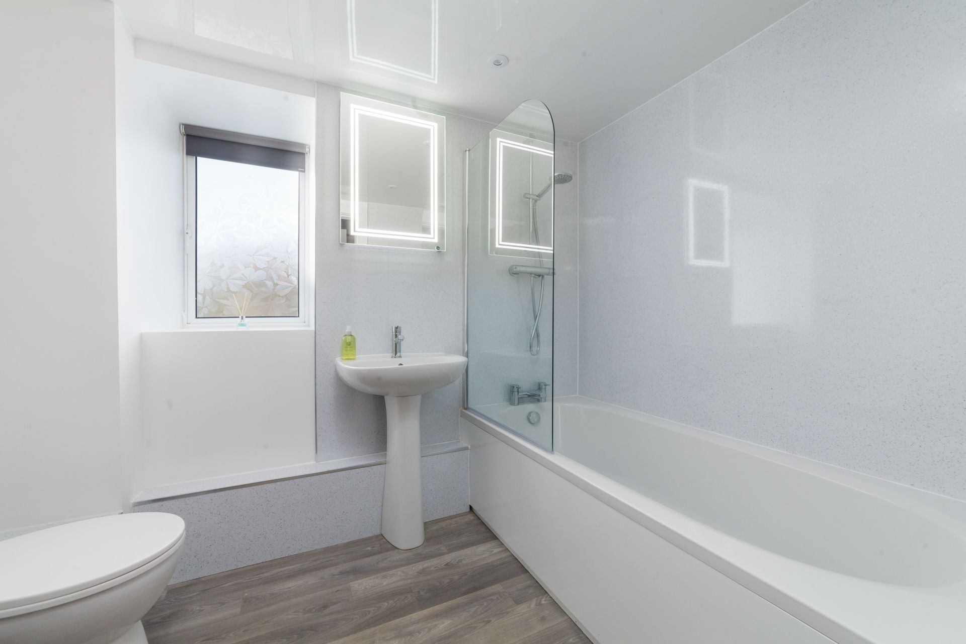 Family bathroom: Shower over bath, WC and wash hand basin.