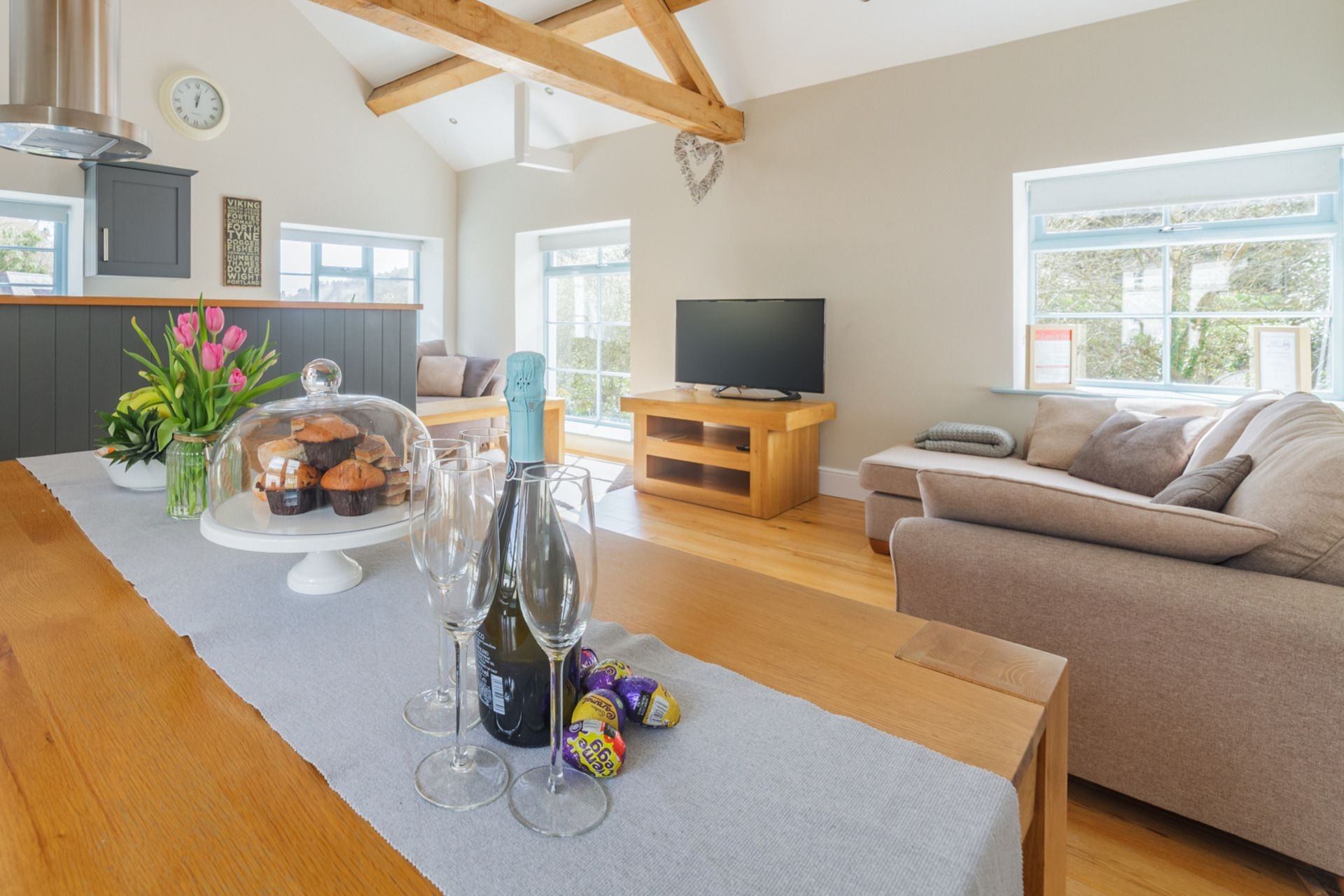 Open plan Lounge / dining area: One large corner sofa, two seater sofa, coffee table, Smart TV, seating for 6 at dining table.
