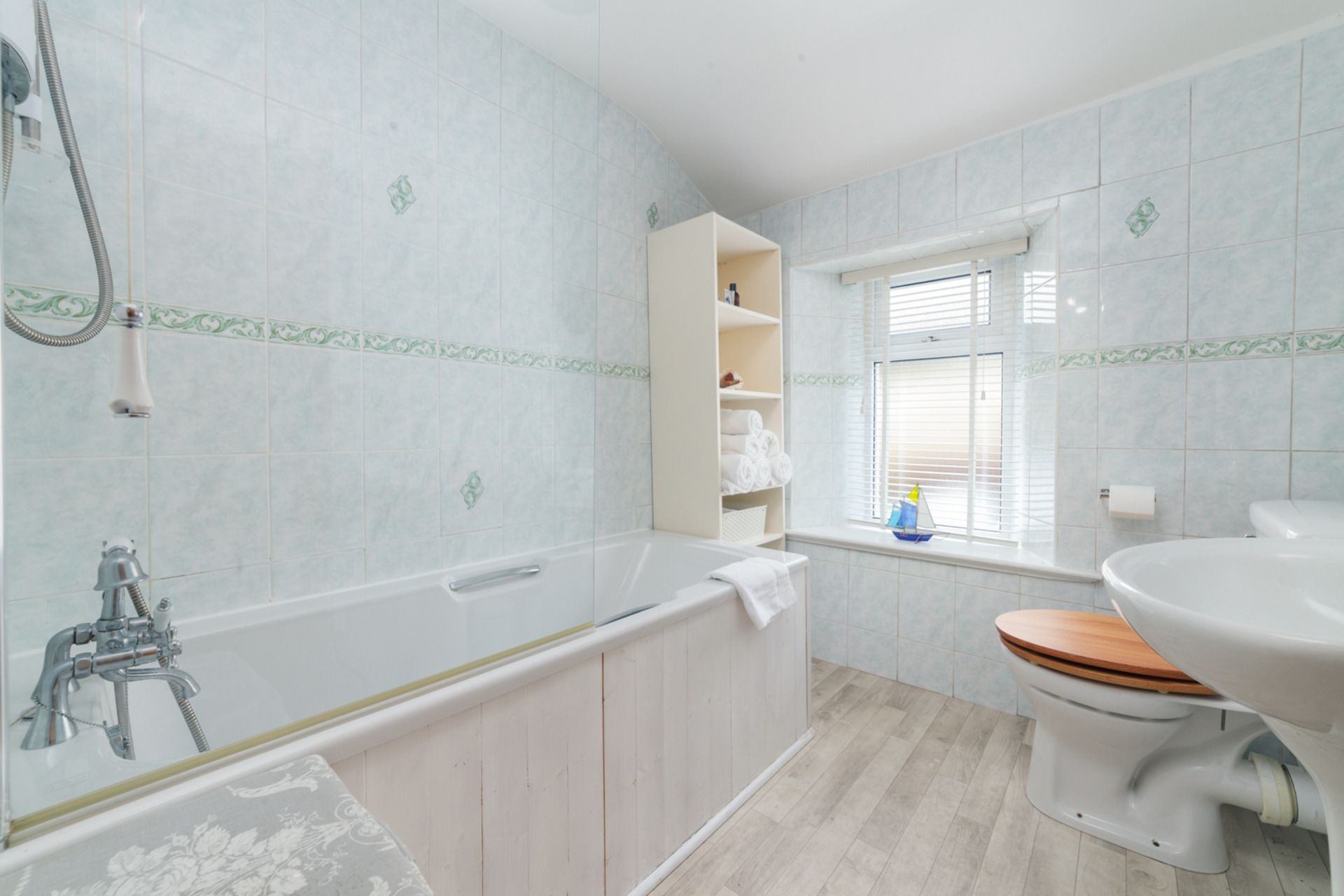 Bathroom: Electric shower over bath, WC and hand wash basin.
