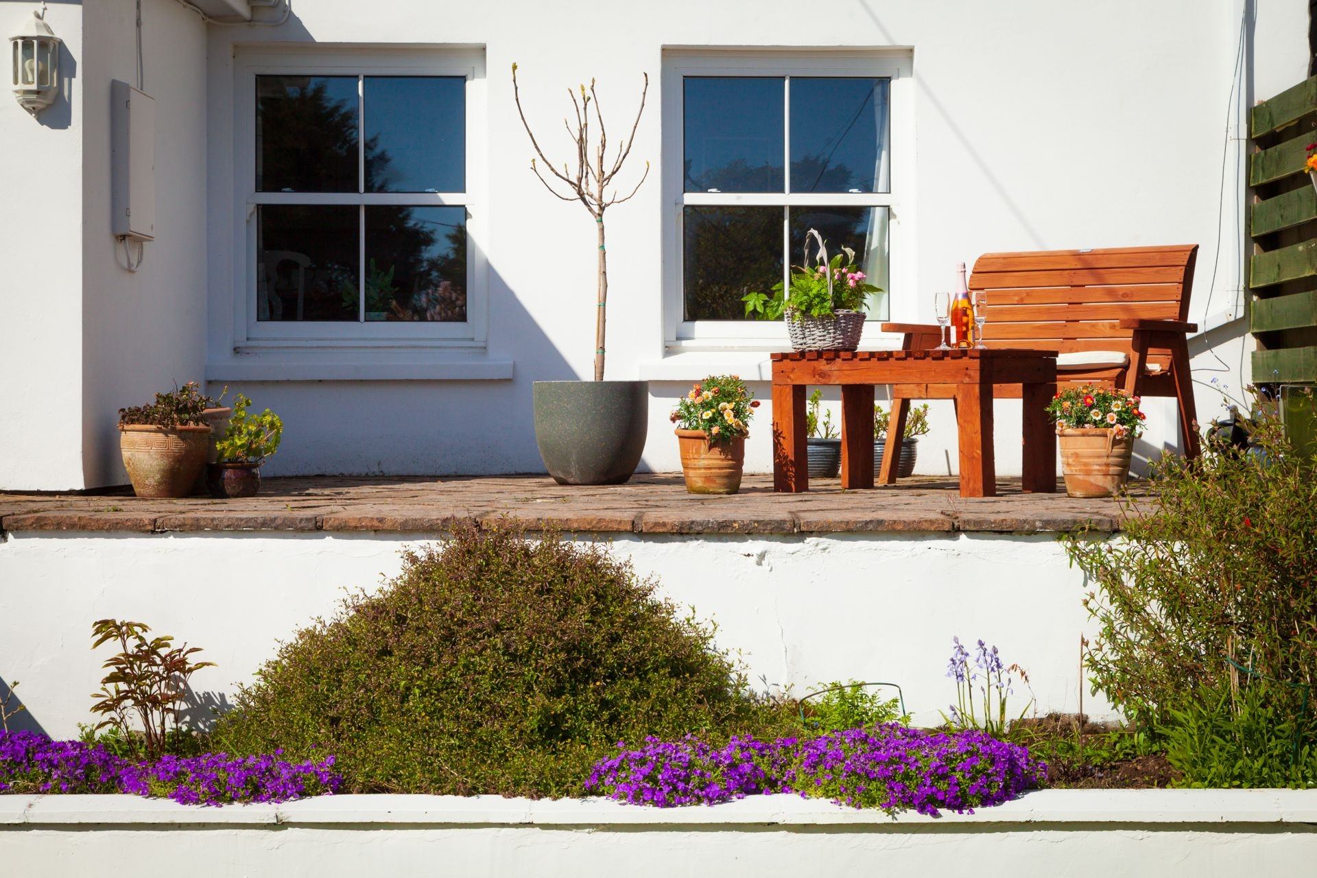 Outdoor space: Outdoor seating for two people and a lawn that is accessed via stone staircase.