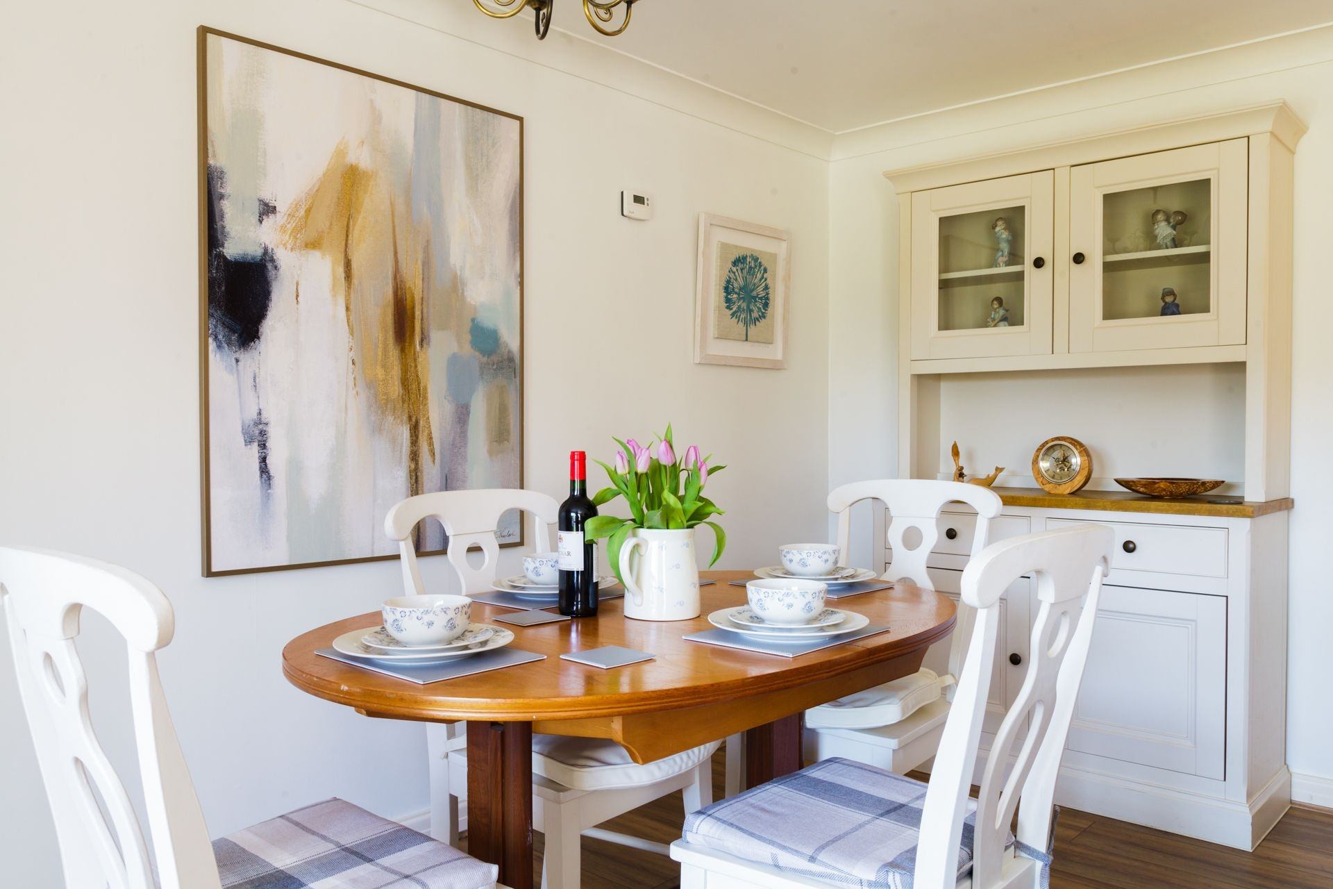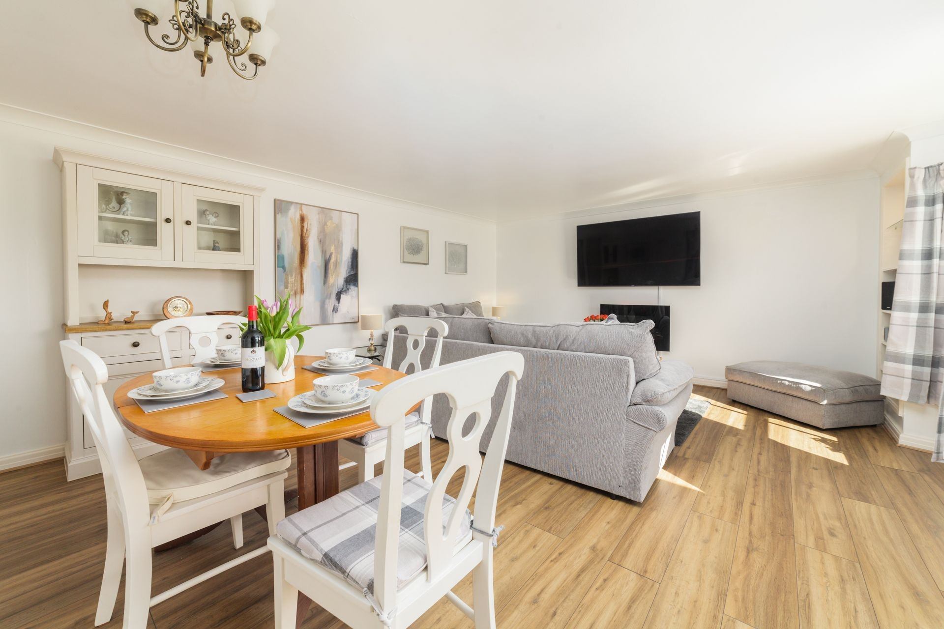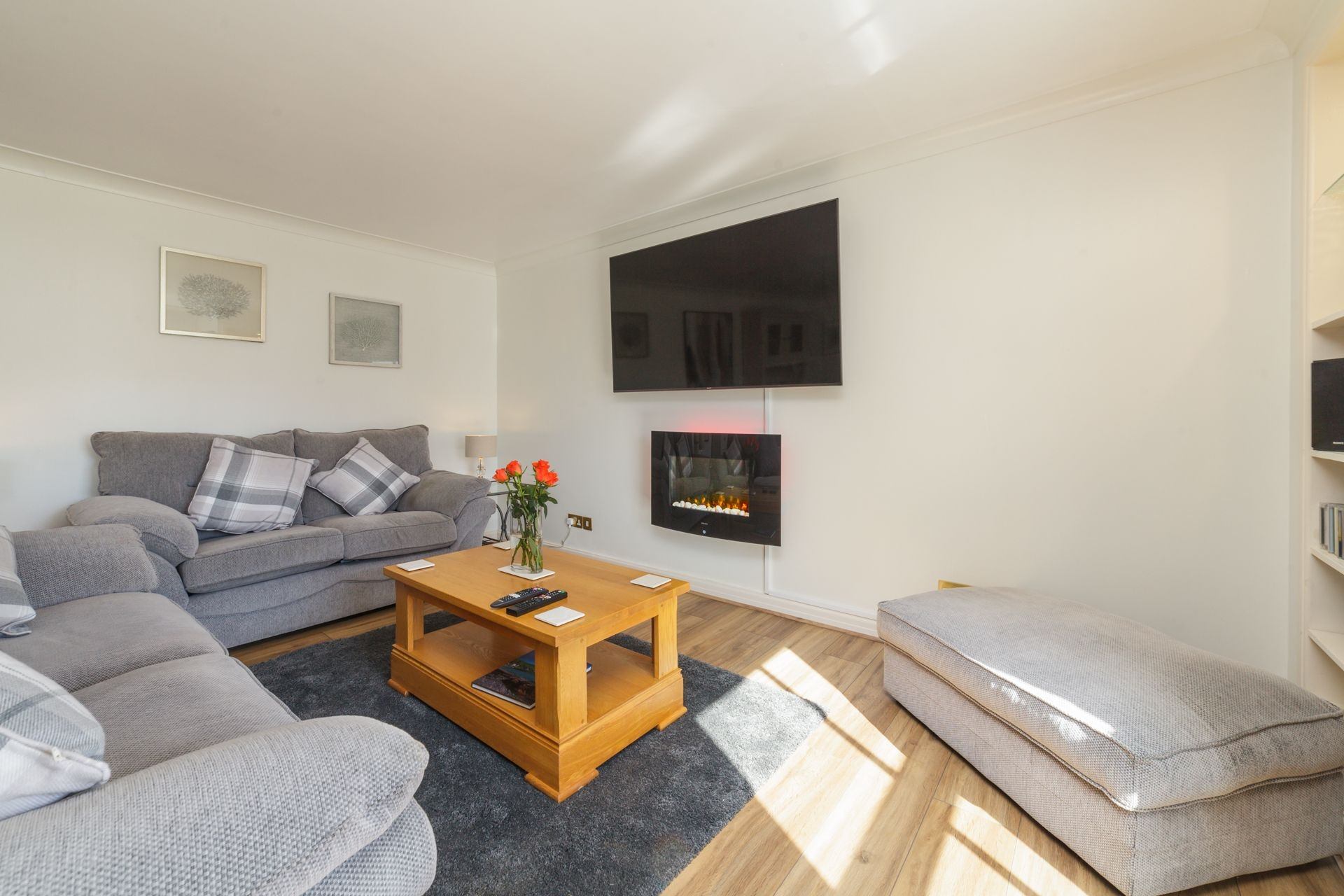 Living / dining room: Two comfortable sofas, coffee table, electric fire, Smart TV and dining table with four chairs.