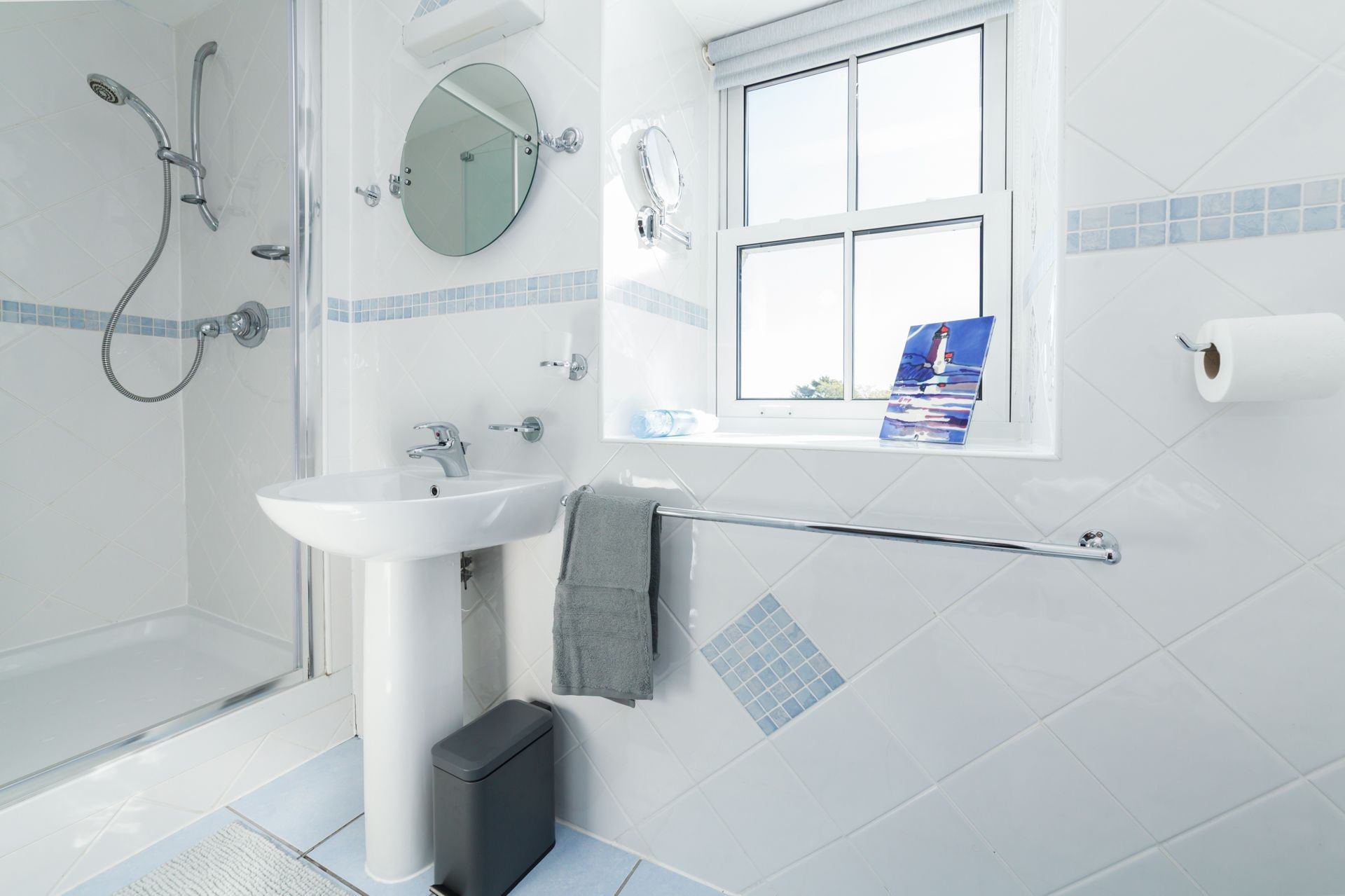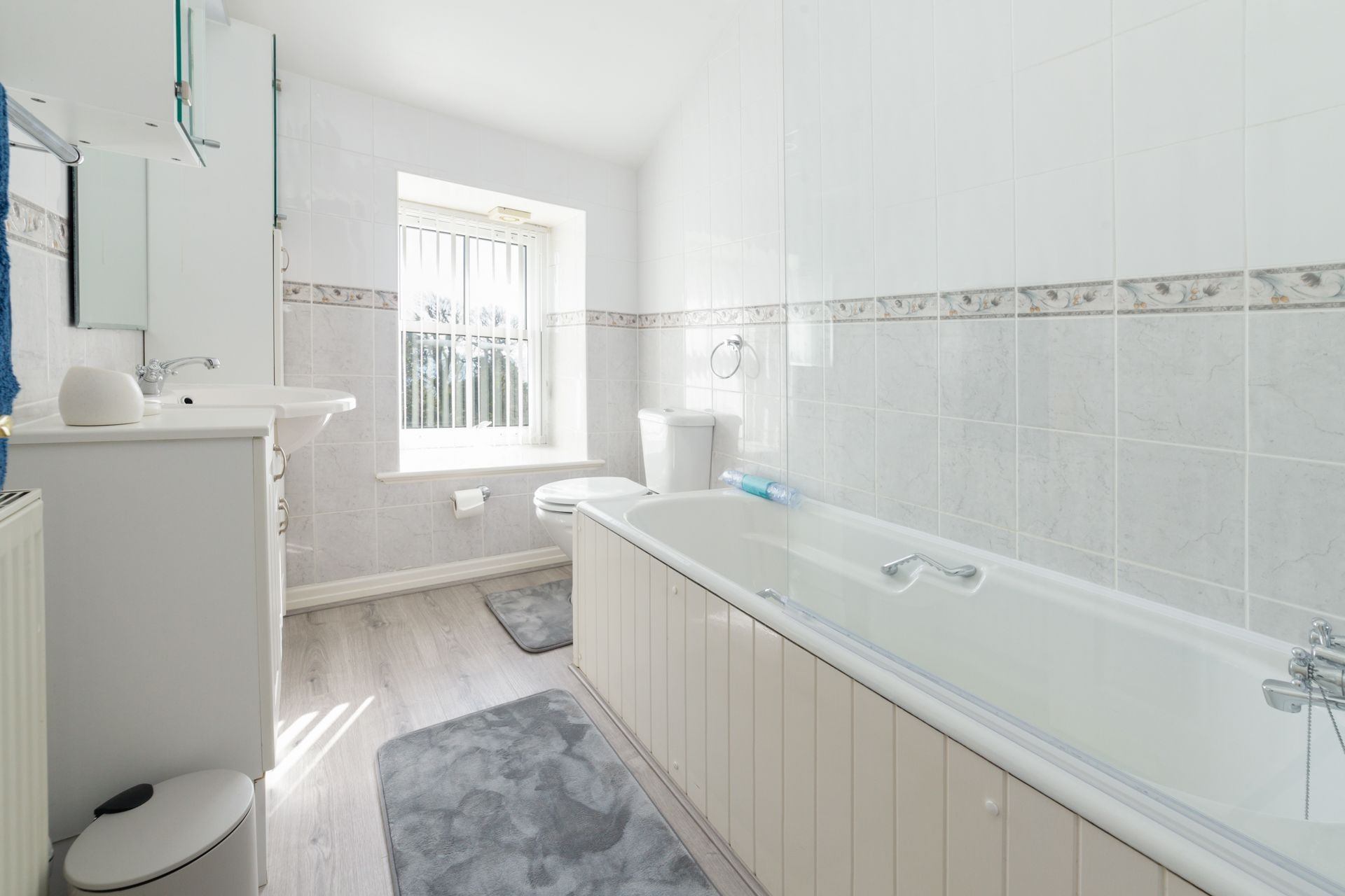 Family bathroom: Shower over bath, WC and wash hand basin with vanity cabinet.