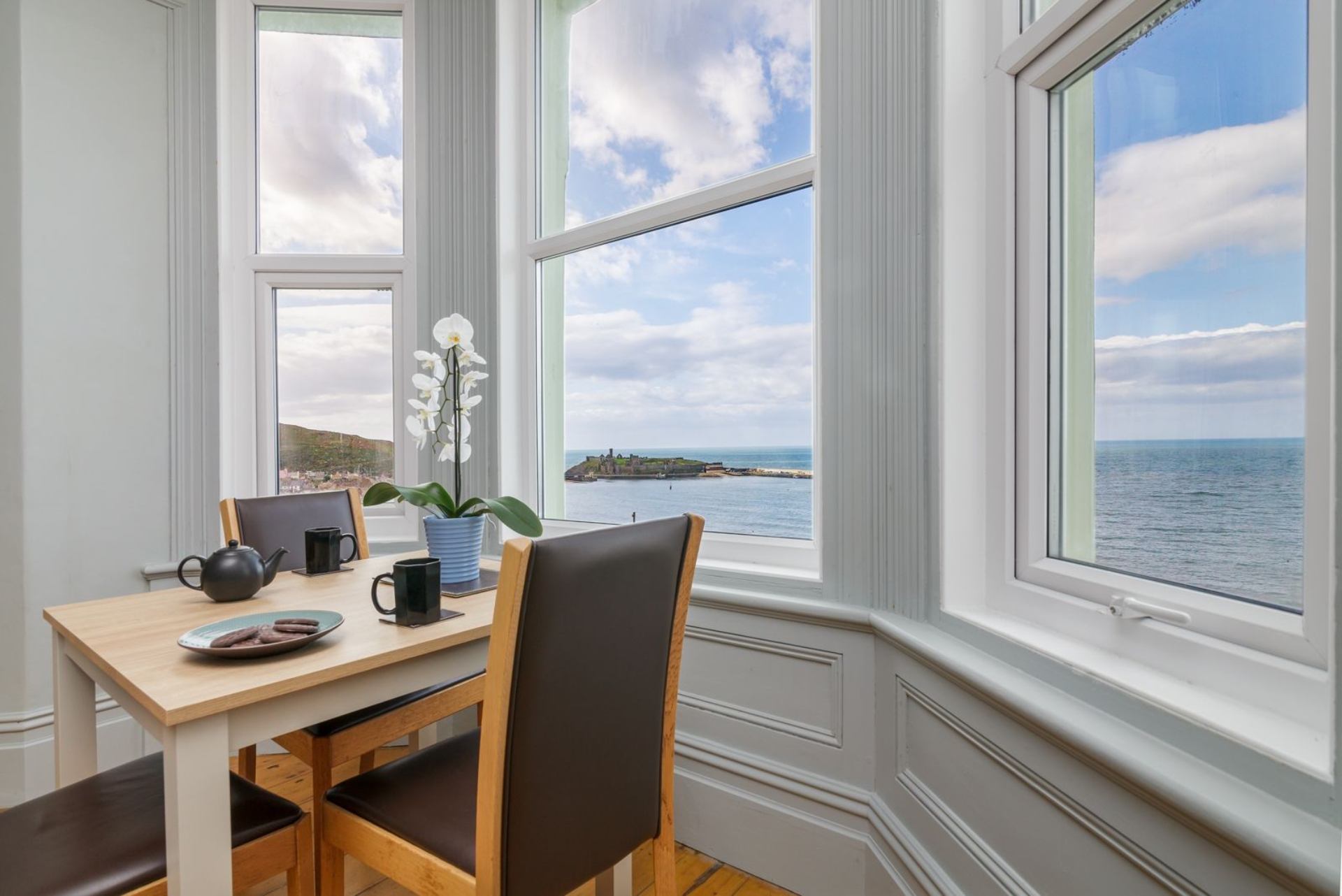 Lovely spacious period property with fantastic views of Peel. \nWe had plenty of space in the apartment and the welcome pack left was a lovely surprise.\nThe instructions for everything were clear and concise and when we rang Island Escapes with an issue, it was sorted out professionally and promptly. \nThank you - we would definitely stay here again!