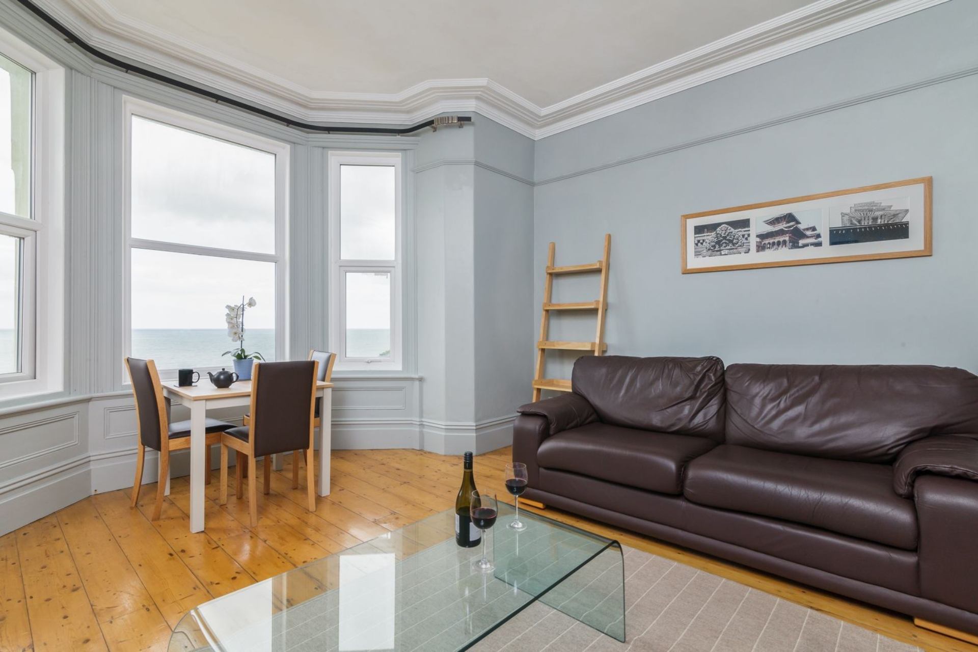 Beautiful views over Peel harbour and dining area well placed. Glass table in centre of lounge ,while decorative not really useful and possibly dangerous for children? Bathroom beginning to look a bit shabby and steams up after showers ,so water runs down walls&collects on toilet, even with fan on\nHowever towels,sheets,duvets etc were spotless as was the kitchen. The apartment was beautifully warm so a real bonus! Sadly entrance via kitchen door does look a bit dilapidated!\nI hope these comments are helpful as we did enjoy our stay, our second one at this apartment.