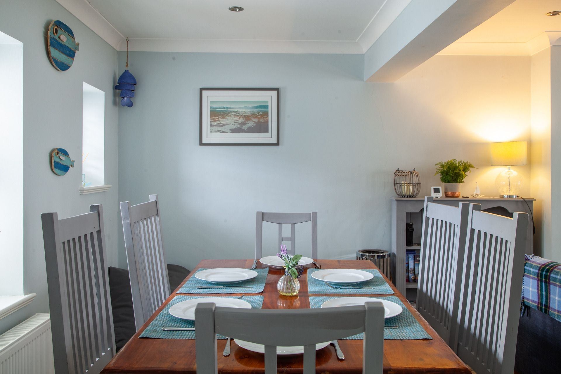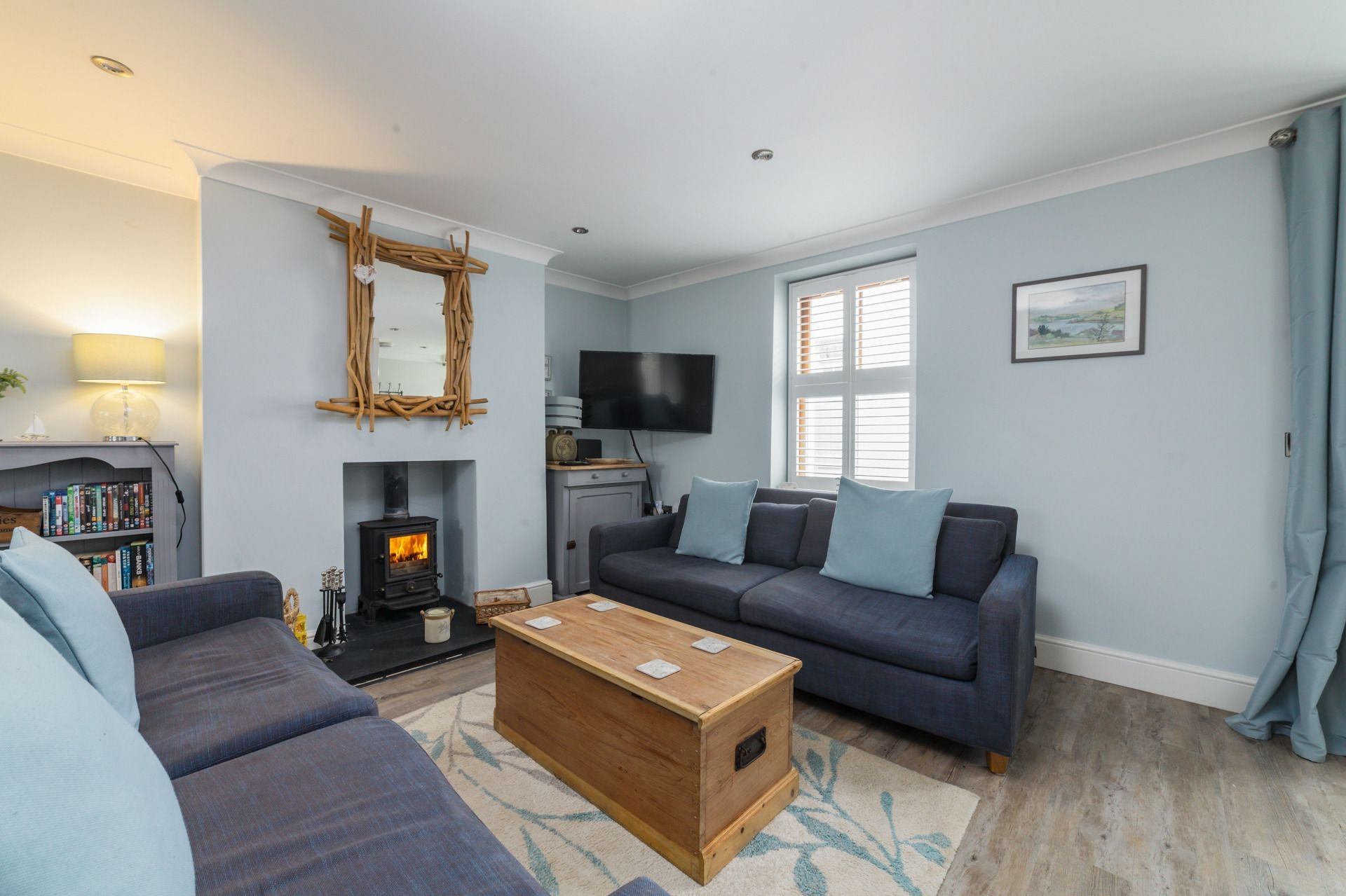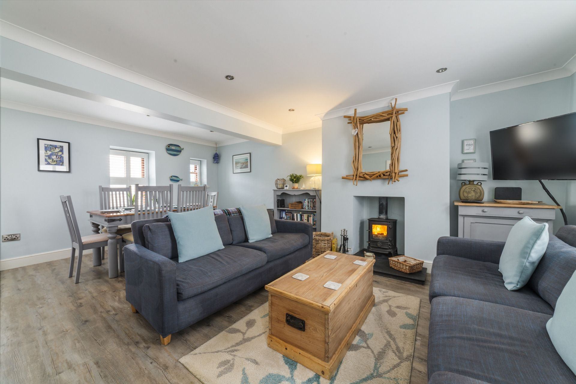 Living area: Two comfortable sofas, smart TV with Sky, coffee table, dining table with six chairs & a log burner.