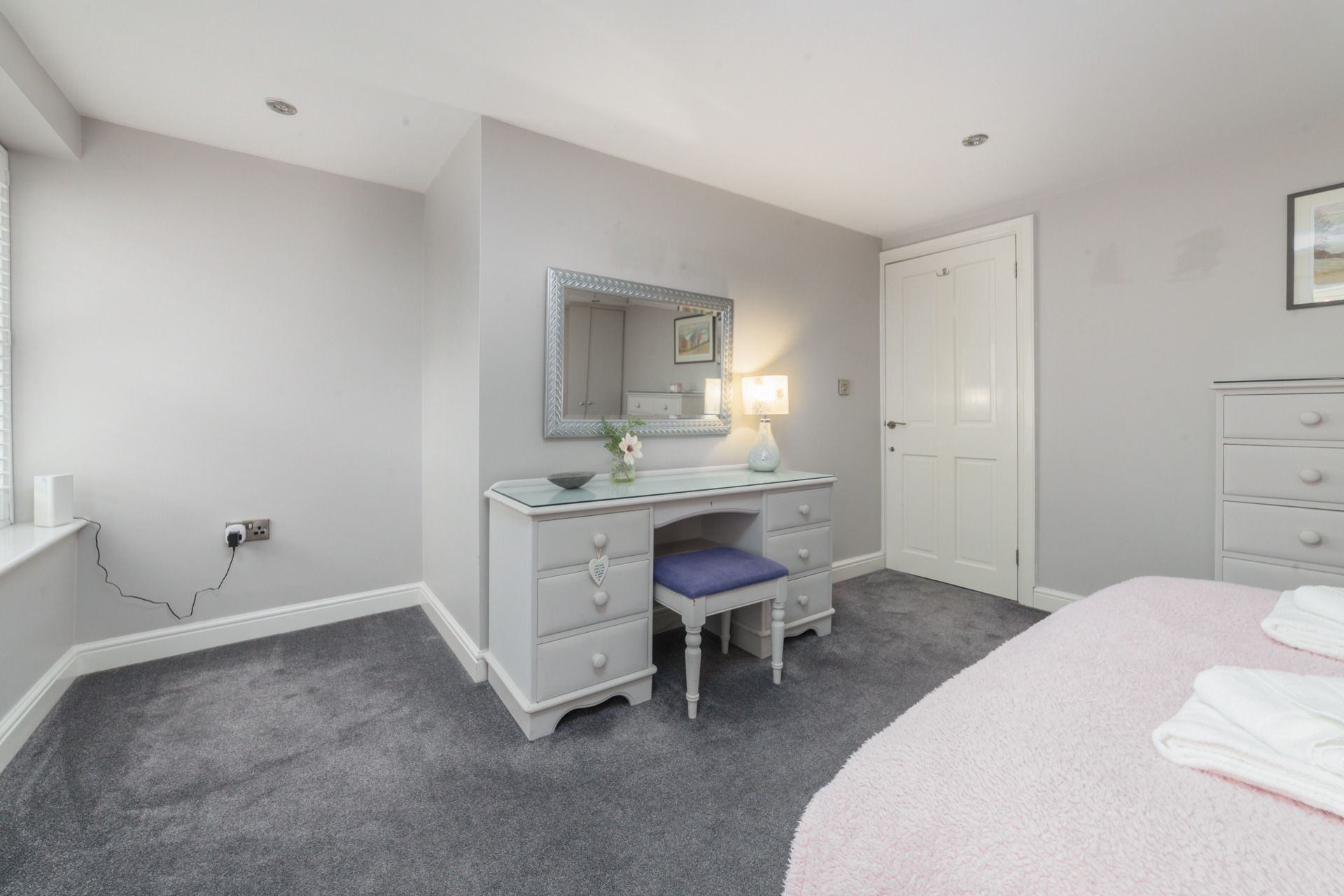 Bedroom 1: Double bed, bedside tables, two wardrobes, chest of drawers, dressing table with mirror.