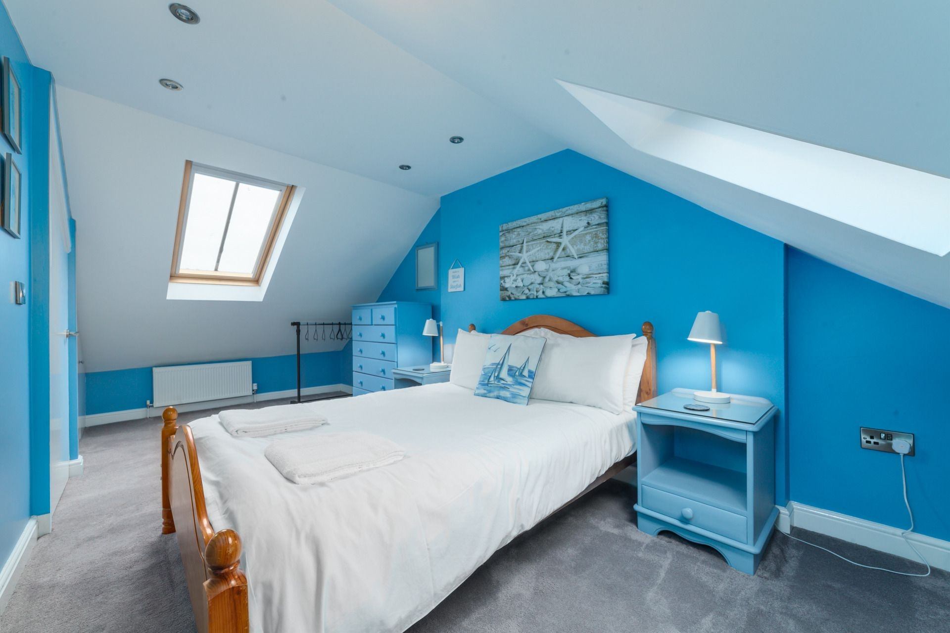 Bedroom 2: Double bed, bedside tables, chest of drawers, hanging space, Velux windows with views out to Peel castle.