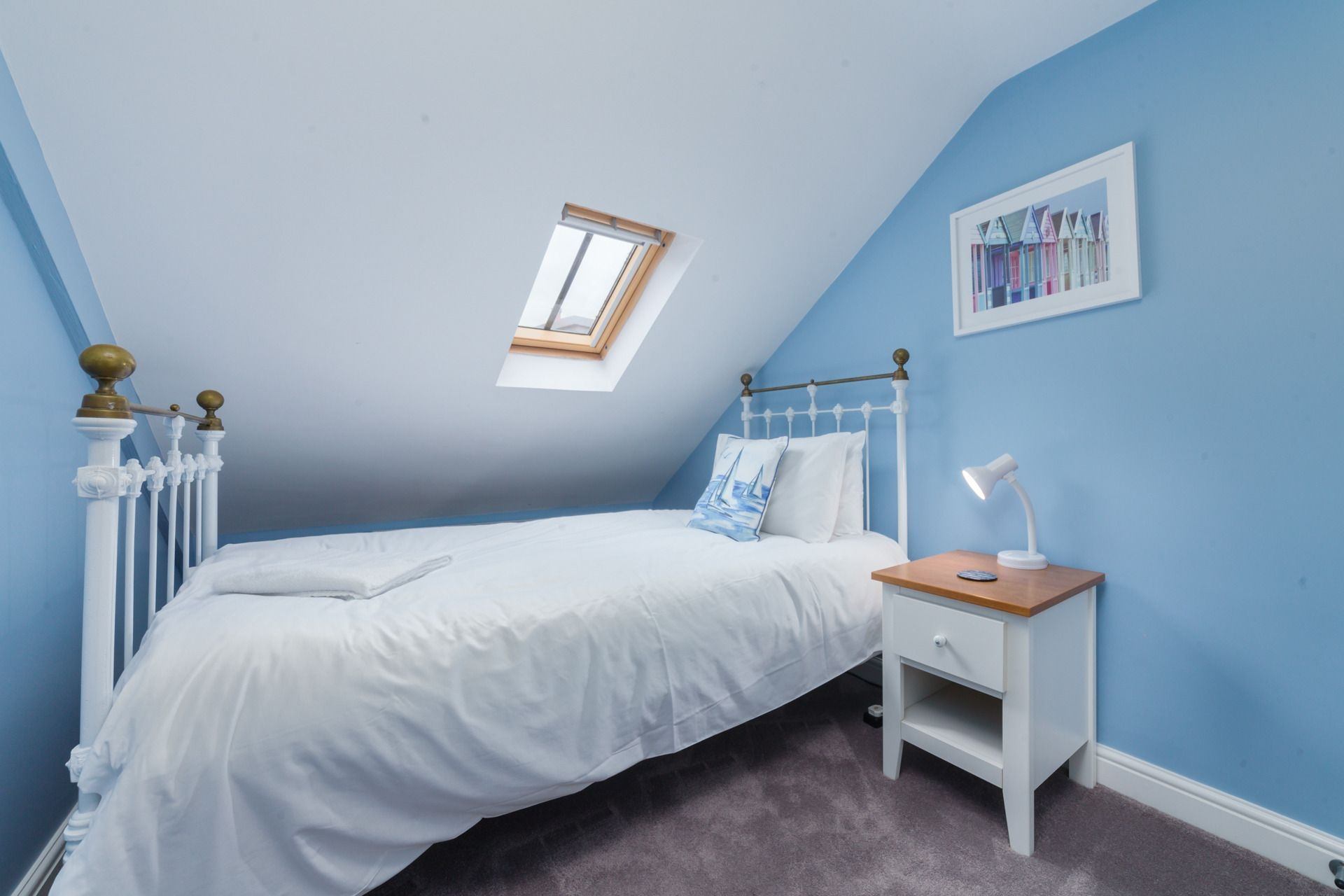 Bedroom 3: Single bed, bedside table, closet, Velux window.
