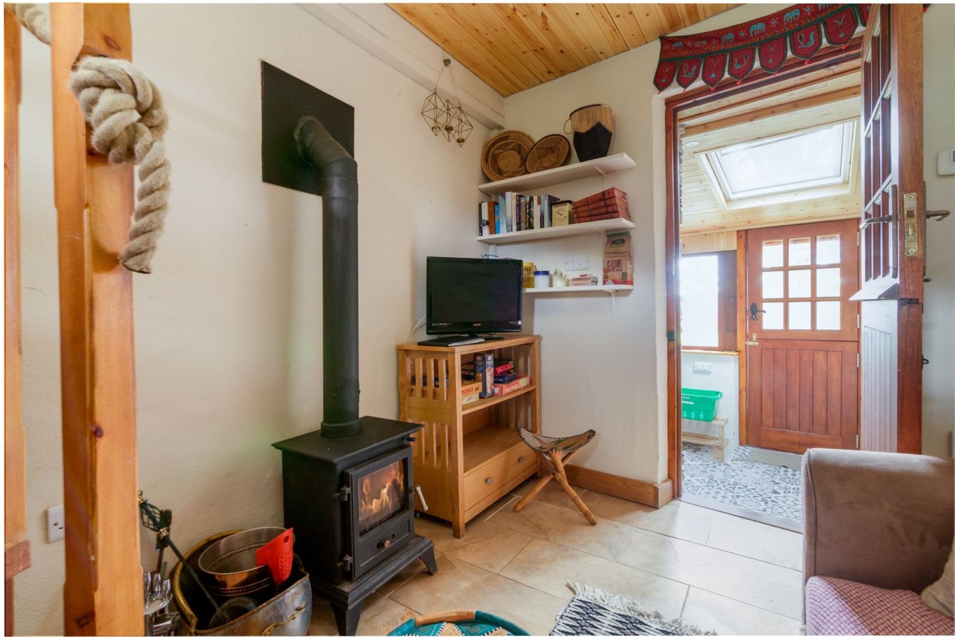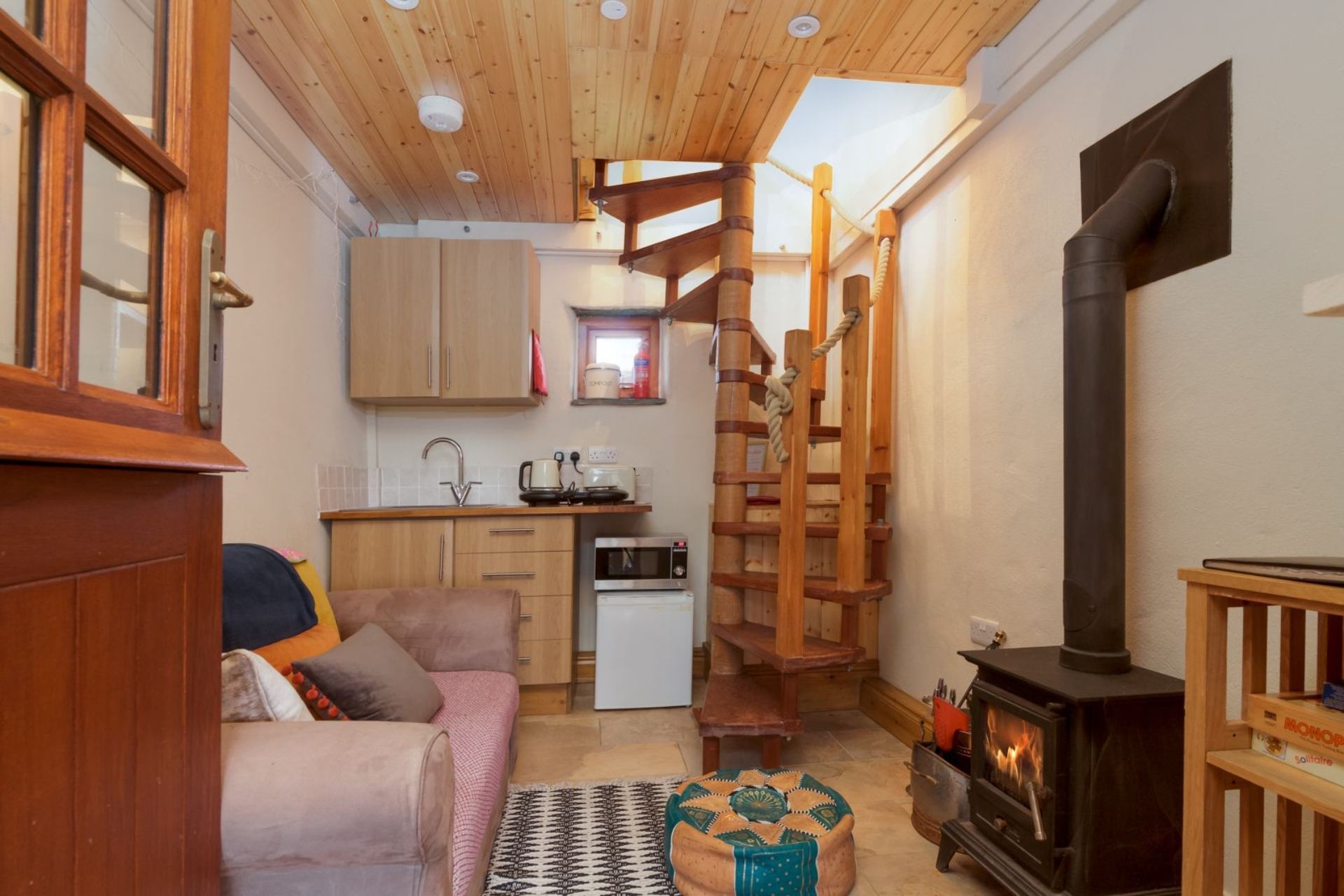 Book nowDownstairs is a sitting room and kitchen area, with a wood burning stove. This is central to the cosy guest experience. Fairy lights and a record player add to the relaxingly warm atmosphere.