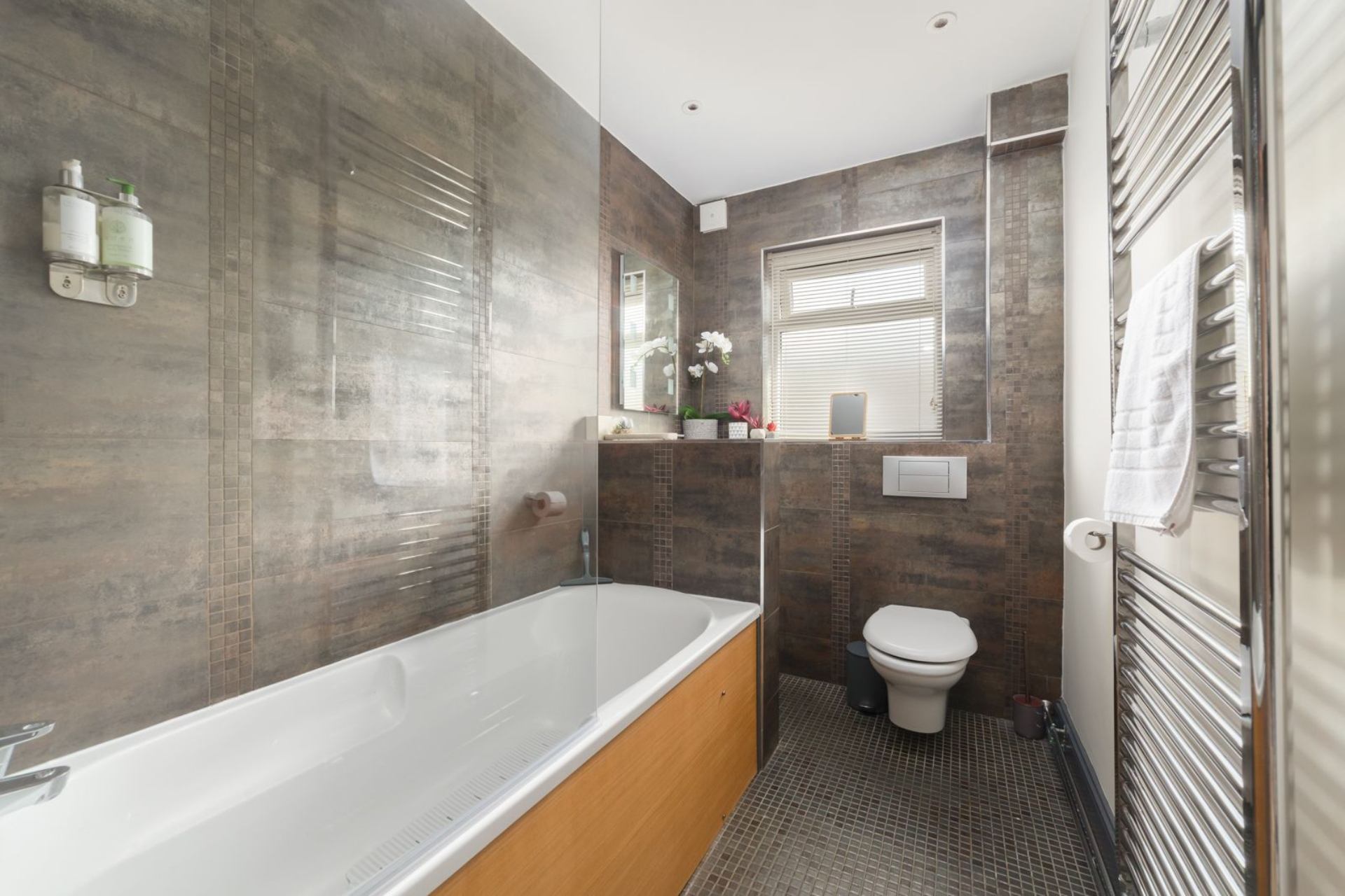 Bathroom: Bath with shower over, WC, basin and vanity unit.