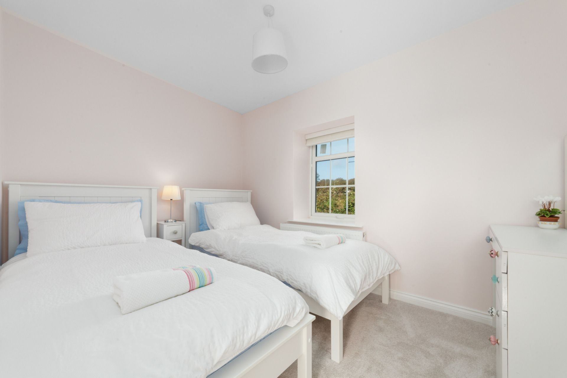 Bedroom 2: Twin beds, hangers, bedside tables, dressing table, hairdryer, mirror and stool