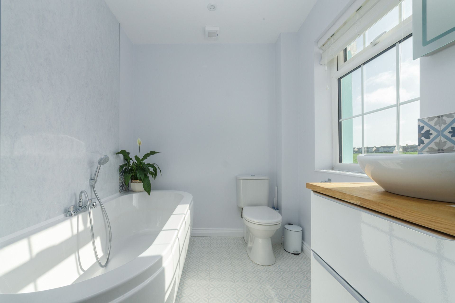 En-suite bathroom: Bath with hand held shower, wash hand basin and WC