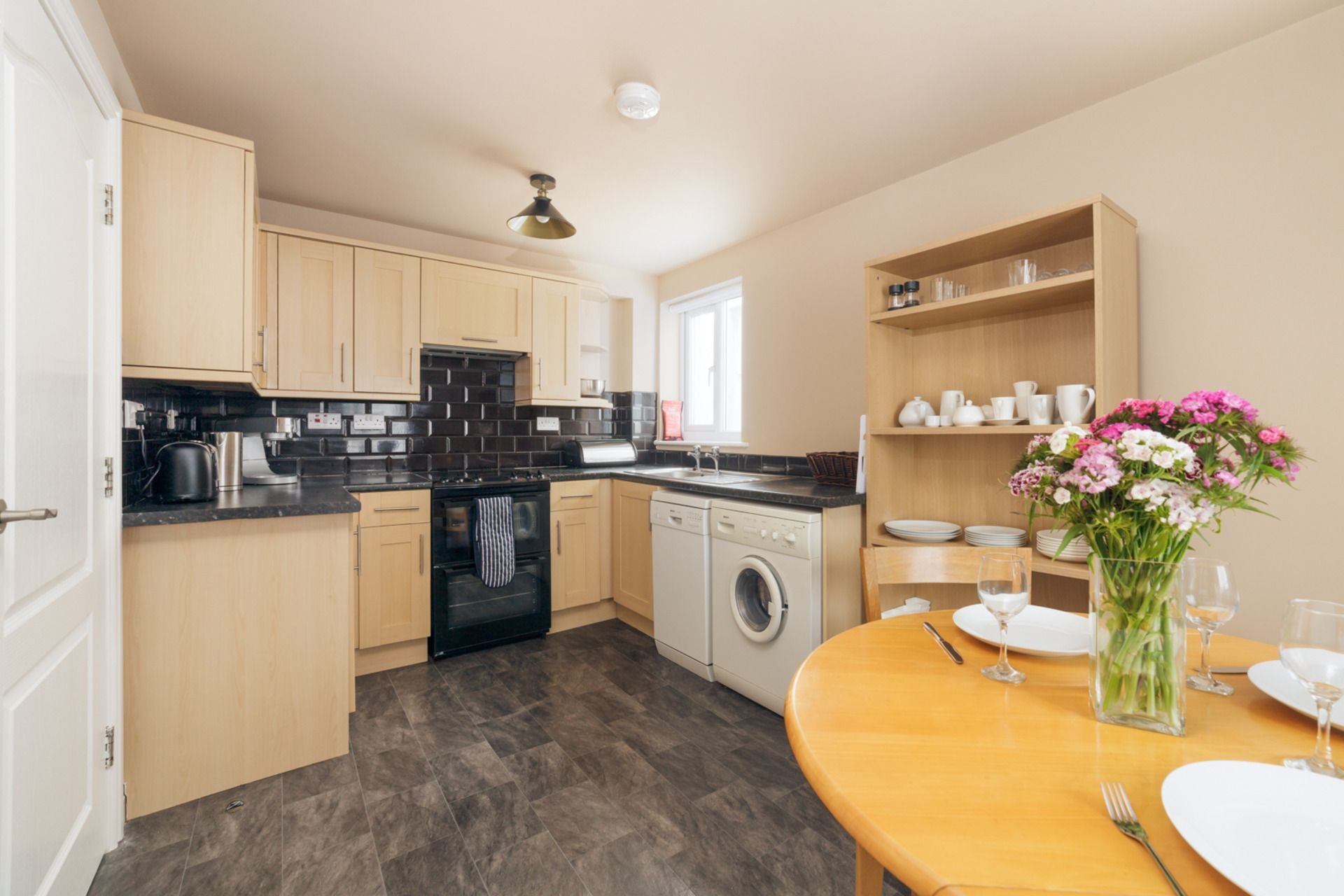 Kitchen: Oven, ceramic hob, fridge, dishwasher, washer/dryer and dining table with three chairs.