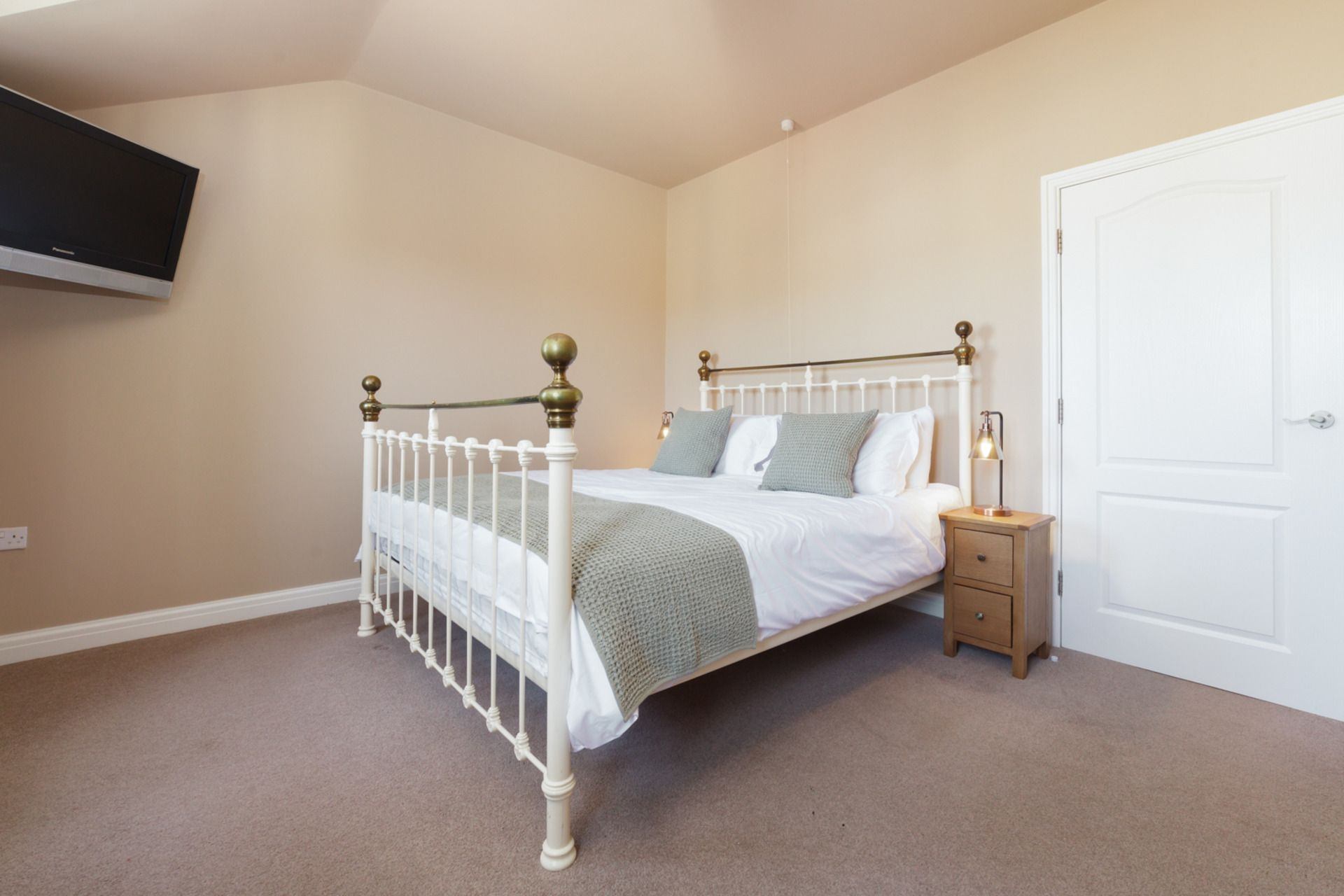 Bedroom 1: King size bed, bedside tables, fitted wardrobe, dressing table and TV.