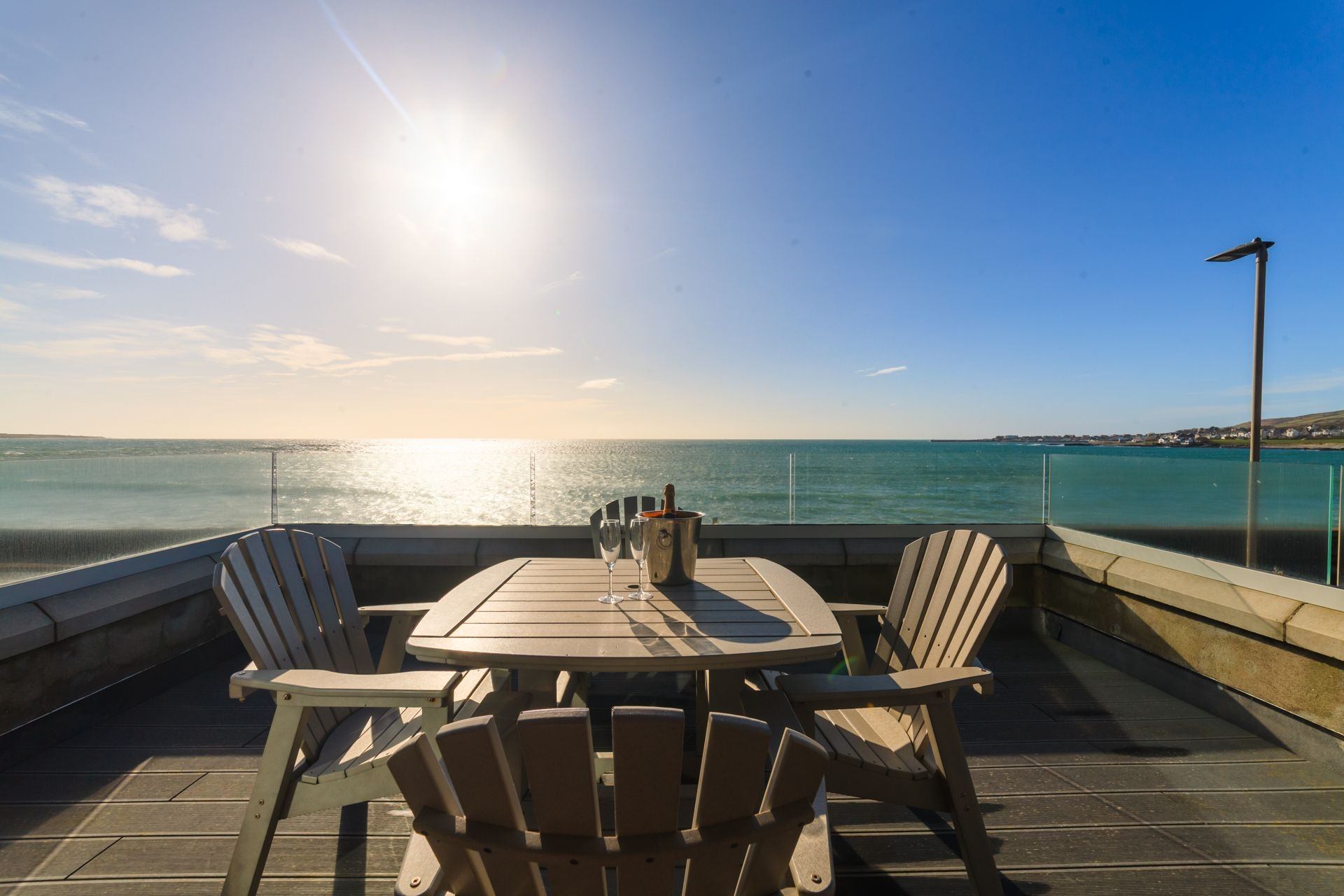 The property features two spacious double bedrooms, each with its own en-suite bathroom, ensuring both comfort and privacy during your stay. A fully equipped kitchen and a comfortable sitting room provide everything you need to relax and unwind, while the first-floor balcony offers breathtaking views across Gansey Bay and Brewery Beach. Whether you're enjoying a quiet morning coffee or watching the sun set over the sea, the scenery is simply unforgettable.
