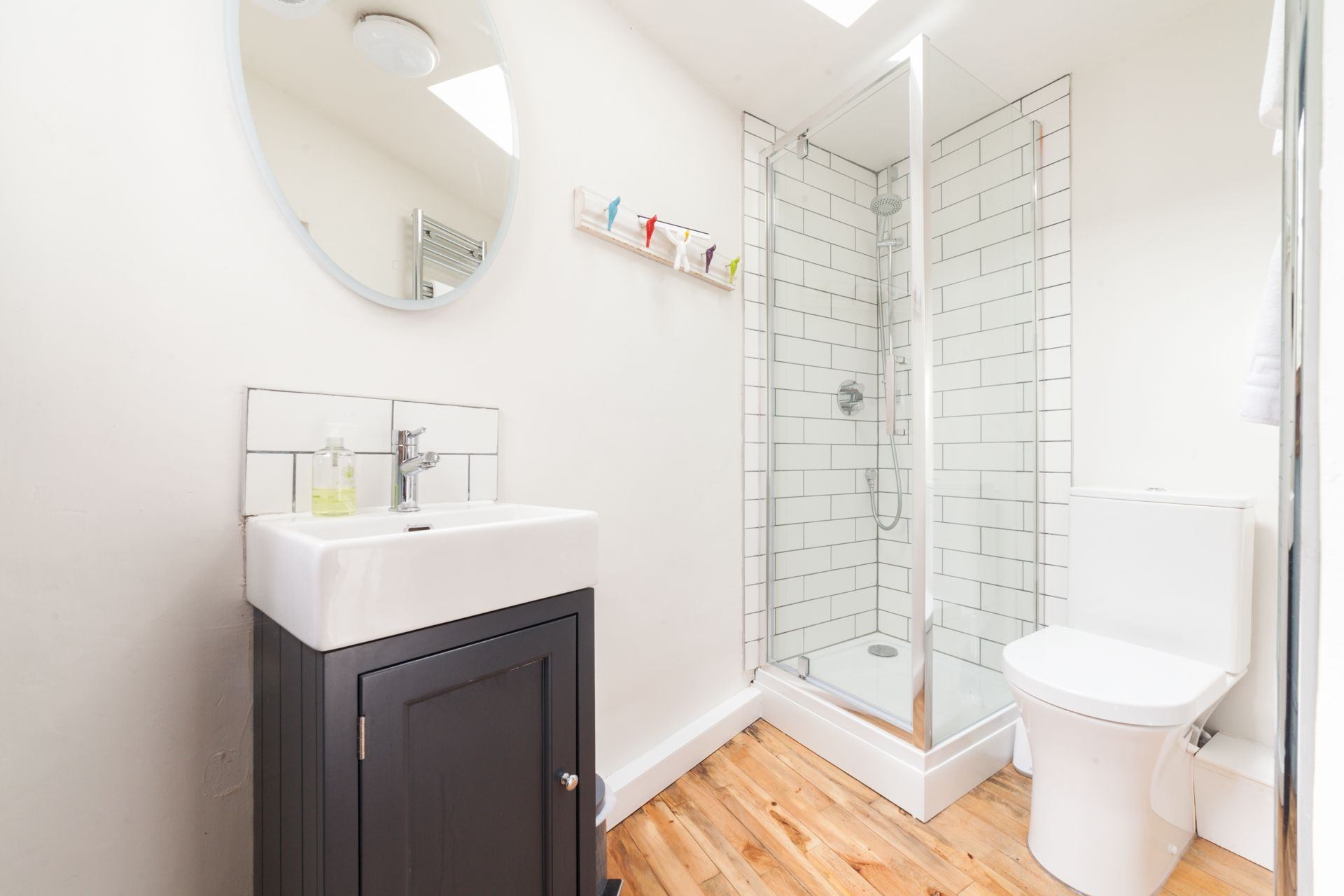 Shower Room: Hand basin and vanity unit, de-mister mirror, Walk in shower.