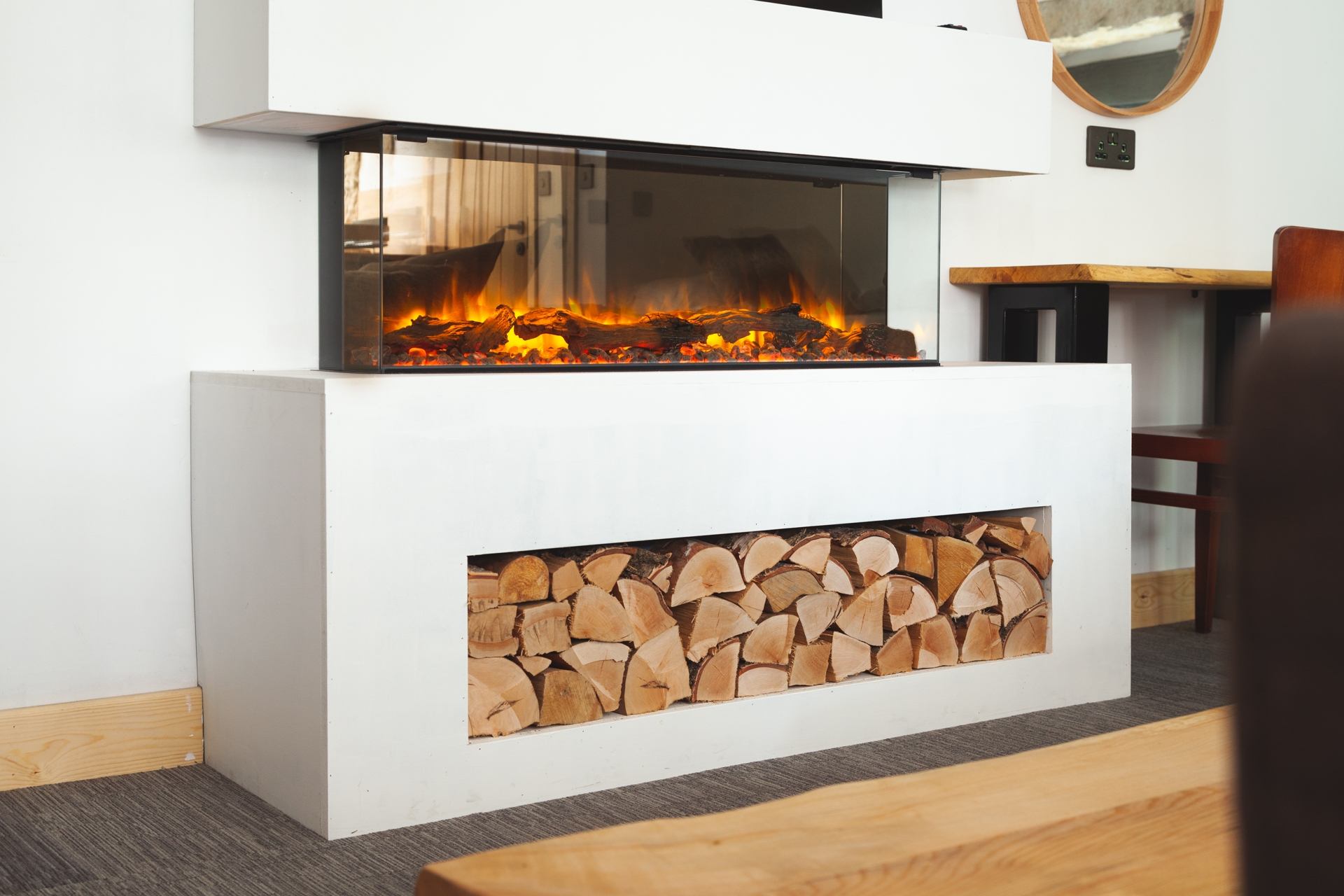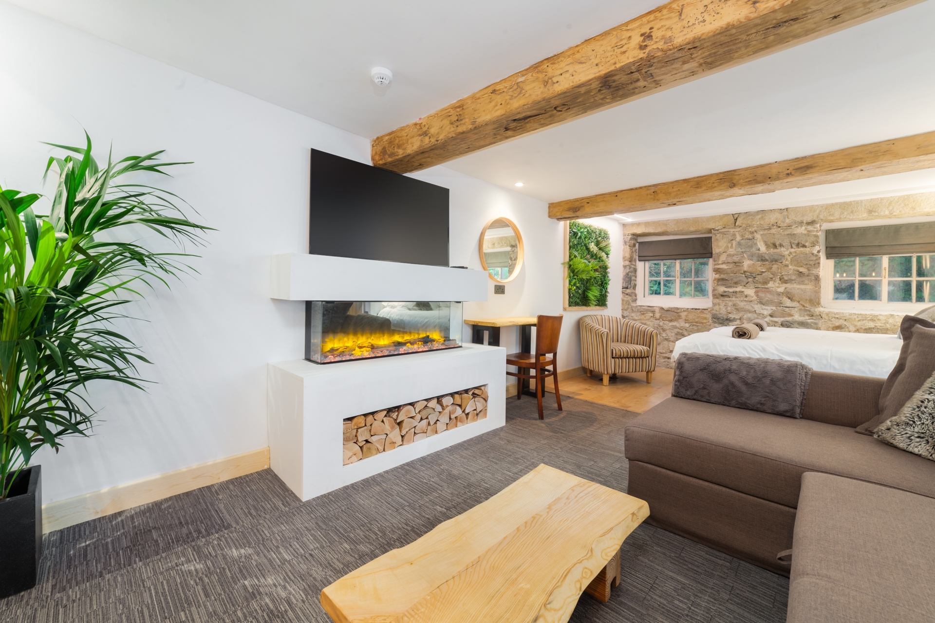 Living area: L-shaped sofa bed which can be added to your booking on request, coffee table, Gazco fire, Smart TV and dining table with two chairs.