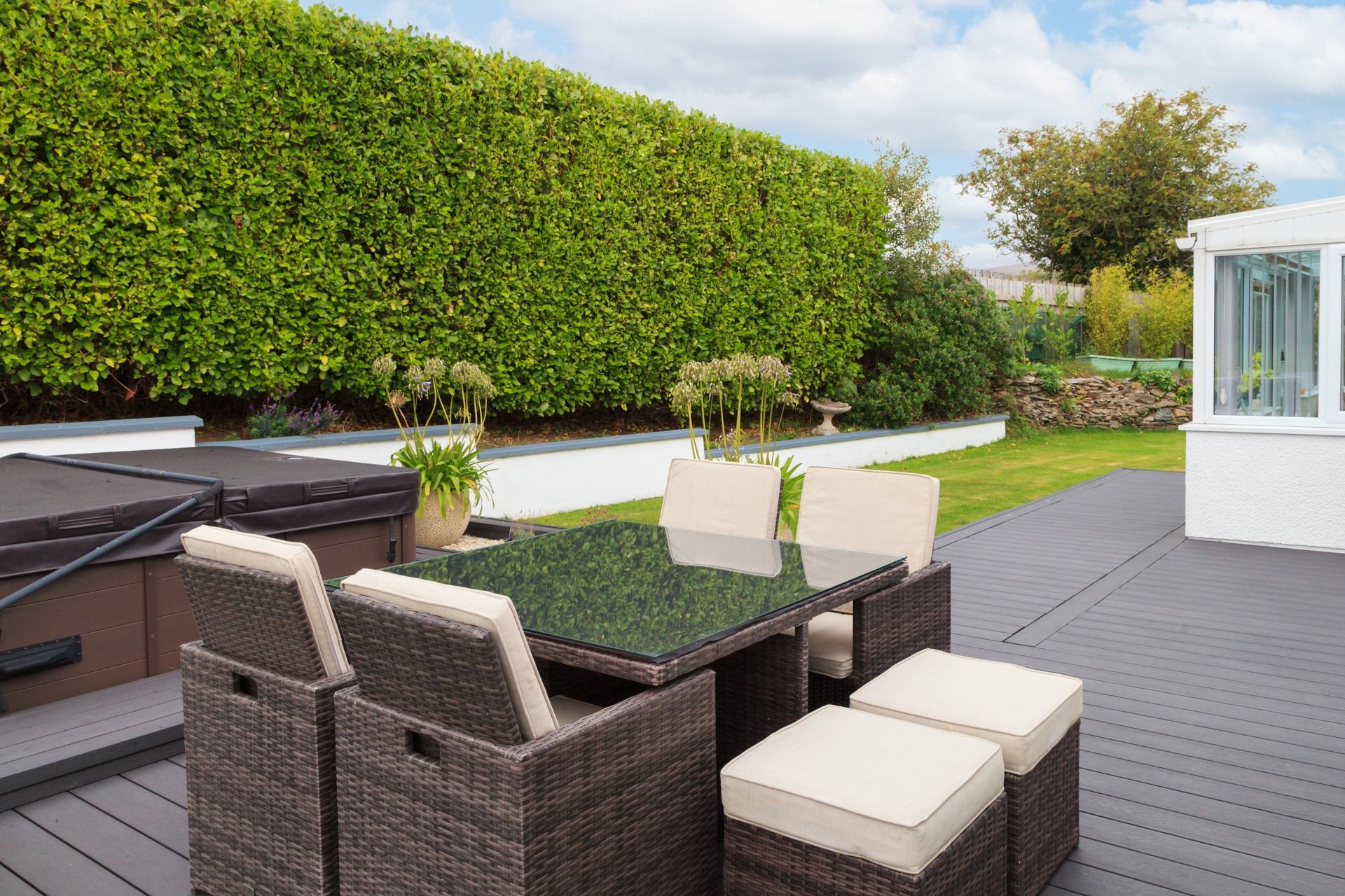 Gardens: Gardens to front, side and rear featuring a table and chairs, patio furniture and BBQ - perfect for outdoor dining and enjoying the sea views.