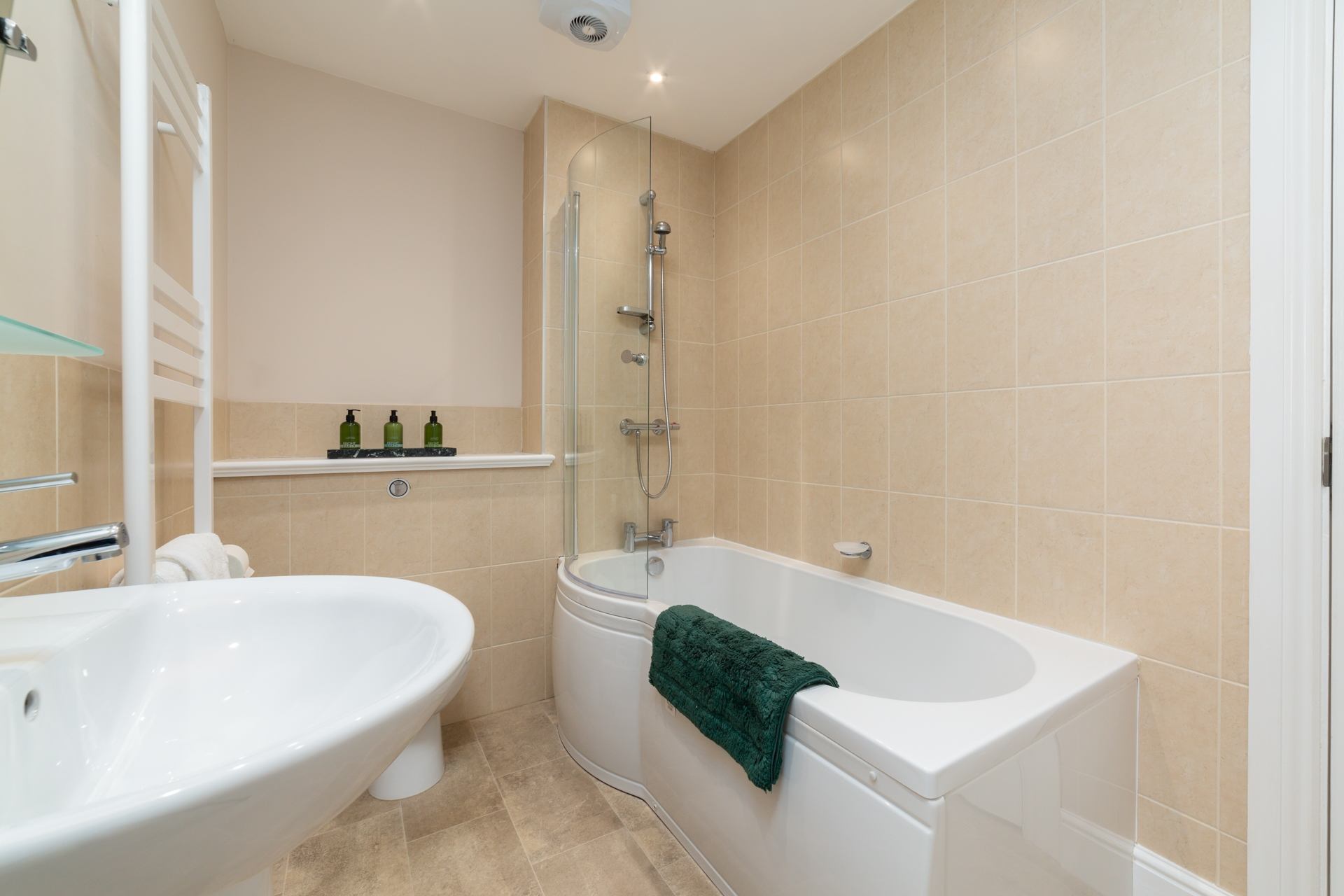 Jack & Jill bathroom: Accessed from both the kitchen and Bedroom 2. Includes a bath with a shower, WC, hand basin, and heated towel rail