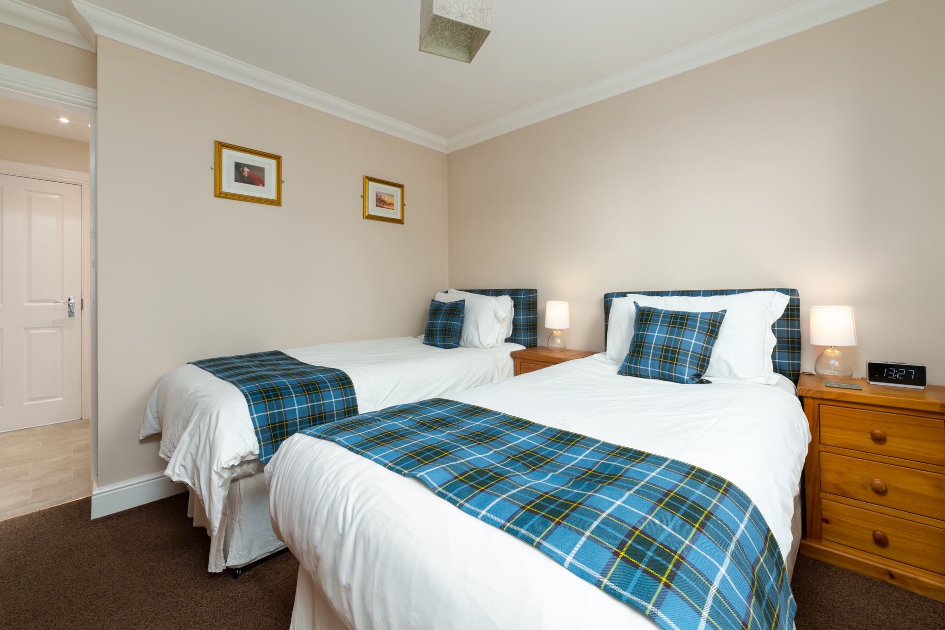 Bedroom 2: Twin beds, bedside tables, wardrobe, dressing table, and flat-screen TV
