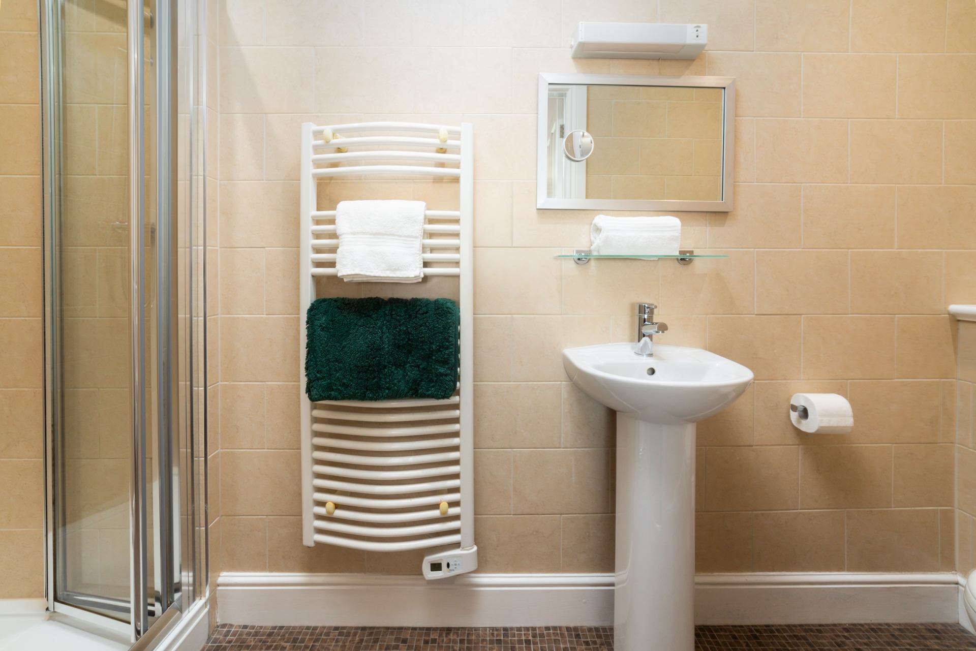 En-suite: Shower cubicle, WC, hand basin, and heated towel rail