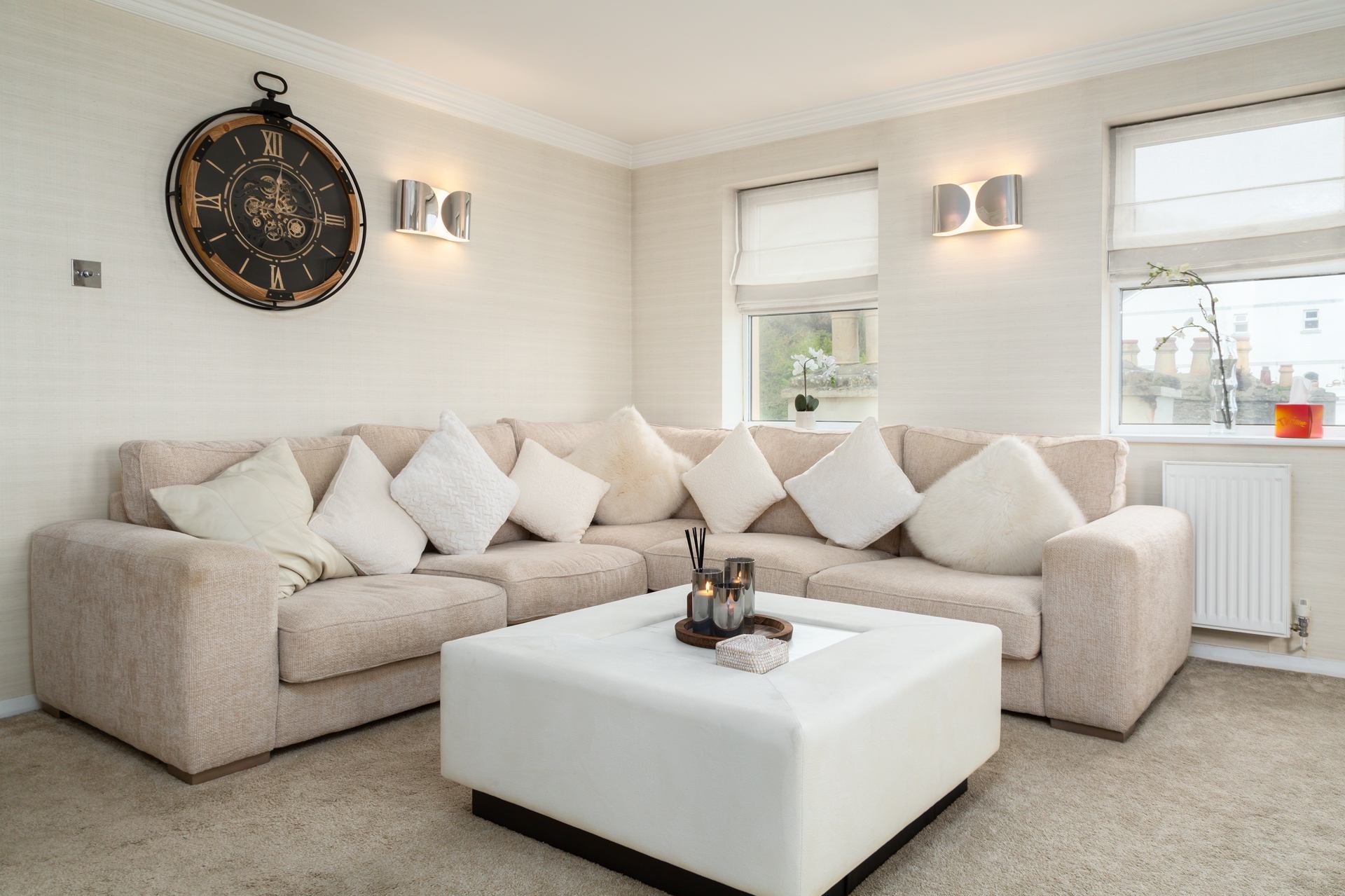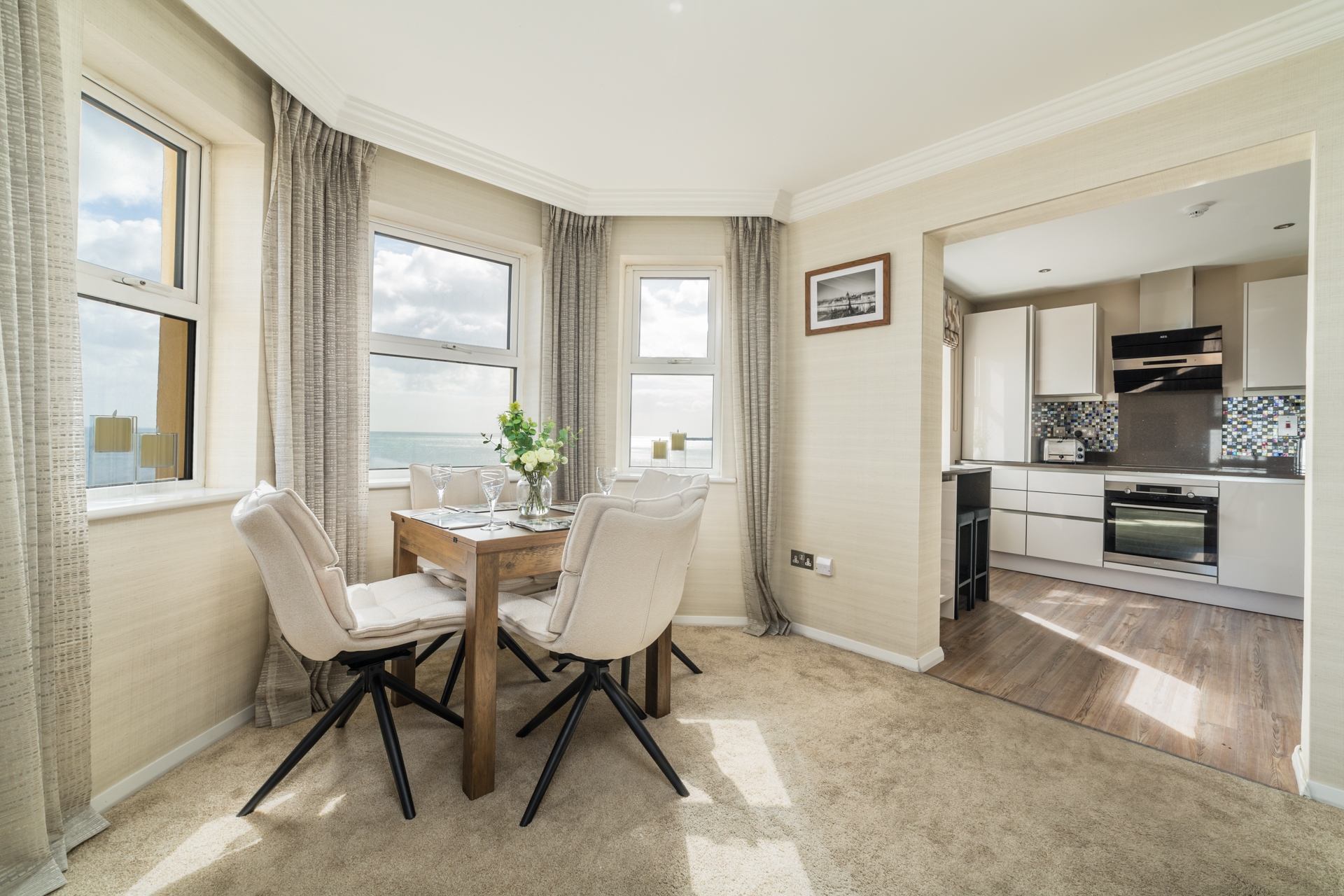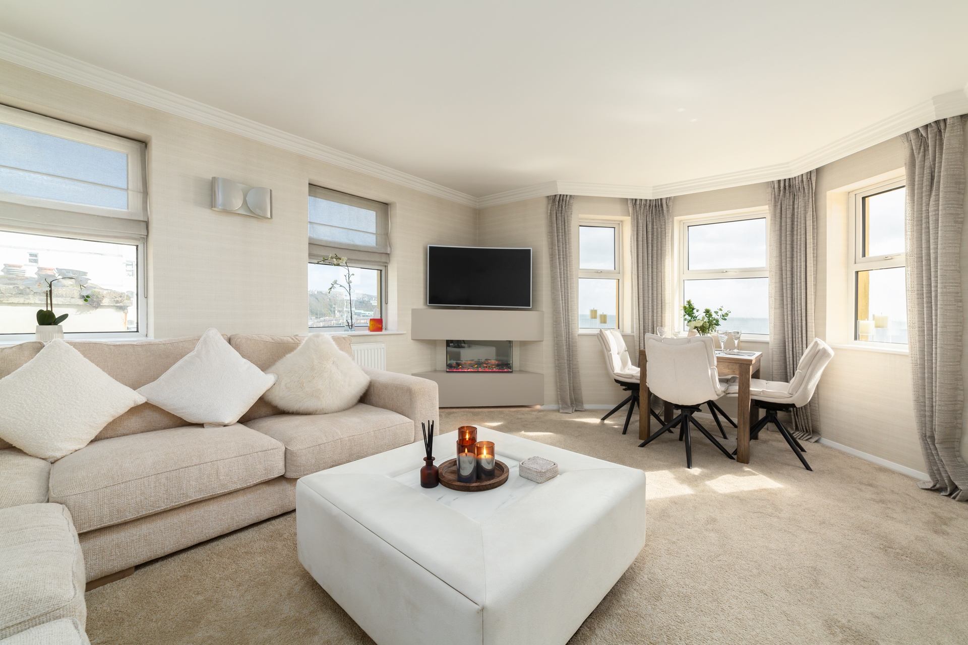 Living Area: Bright and spacious open-plan lounge with a large, exceptionally comfortable L-shaped sofa—perfect for relaxing while taking in the stunning panoramic views across Douglas Promenade. The elevated positioning of the dining table & chairs allows you to watch the horse trams pass by, the beach, and the ferry coming and going.