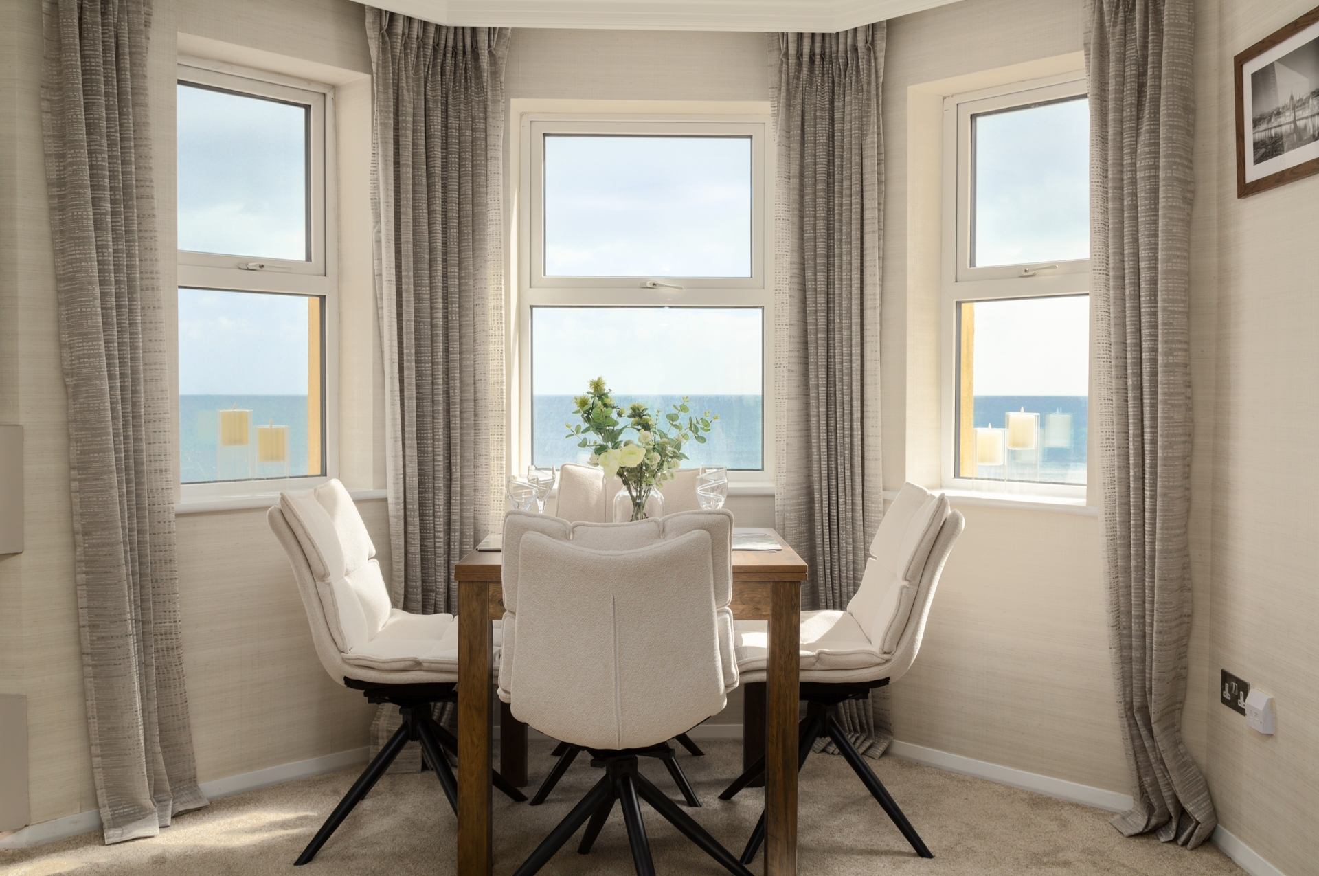 Inside, the apartment is designed for relaxed coastal living. The open-plan lounge and kitchen area is bright and inviting, with a large, exceptionally comfortable L-shaped sofa that's perfect for unwinding after a day exploring. Beneath the TV, a modern electric fire adds a warm, cosy glow for those cooler evenings, creating the perfect atmosphere to relax and watch the world go by. The raised dining area for four is thoughtfully positioned to make the most of those stunning panoramic views, whether it's morning coffee or an evening meal, the backdrop is always spectacular.