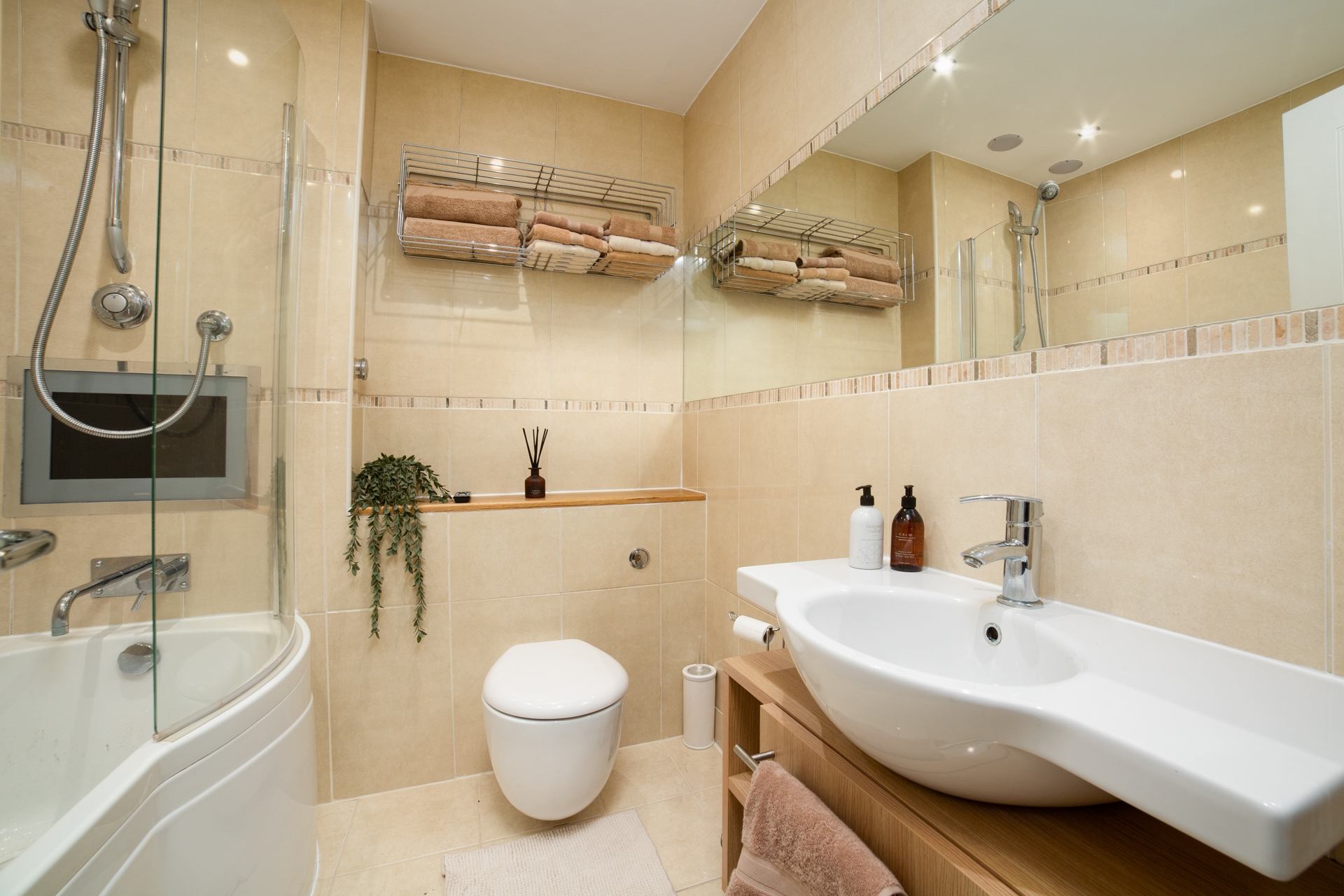 Bathroom: Contemporary bathroom featuring a bath with overhead shower, WC, wash hand basin and heated towel rail.