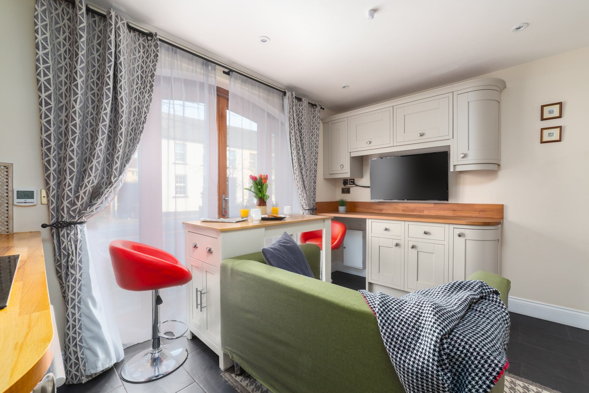 Kitchen/Lounge: Modern fitted kitchen equipped with a dishwasher, fridge/freezer, electric oven and hob, and microwave. Sofa with seating for two, TV, plus a breakfast bar with two stools