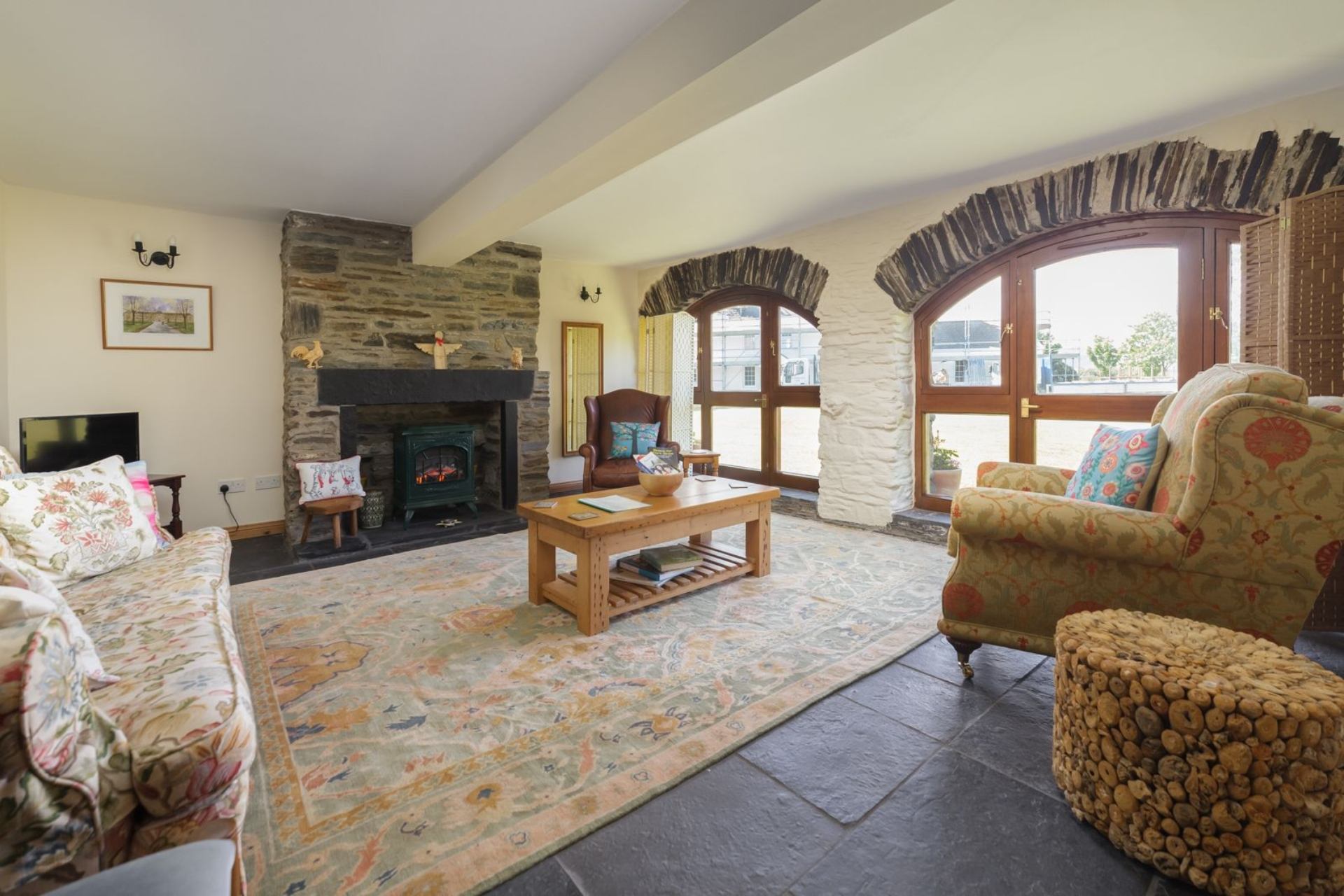 Lounge: Sofa, two comfortable chairs, coffee table, fireplace and TV. Doors open out into the garden