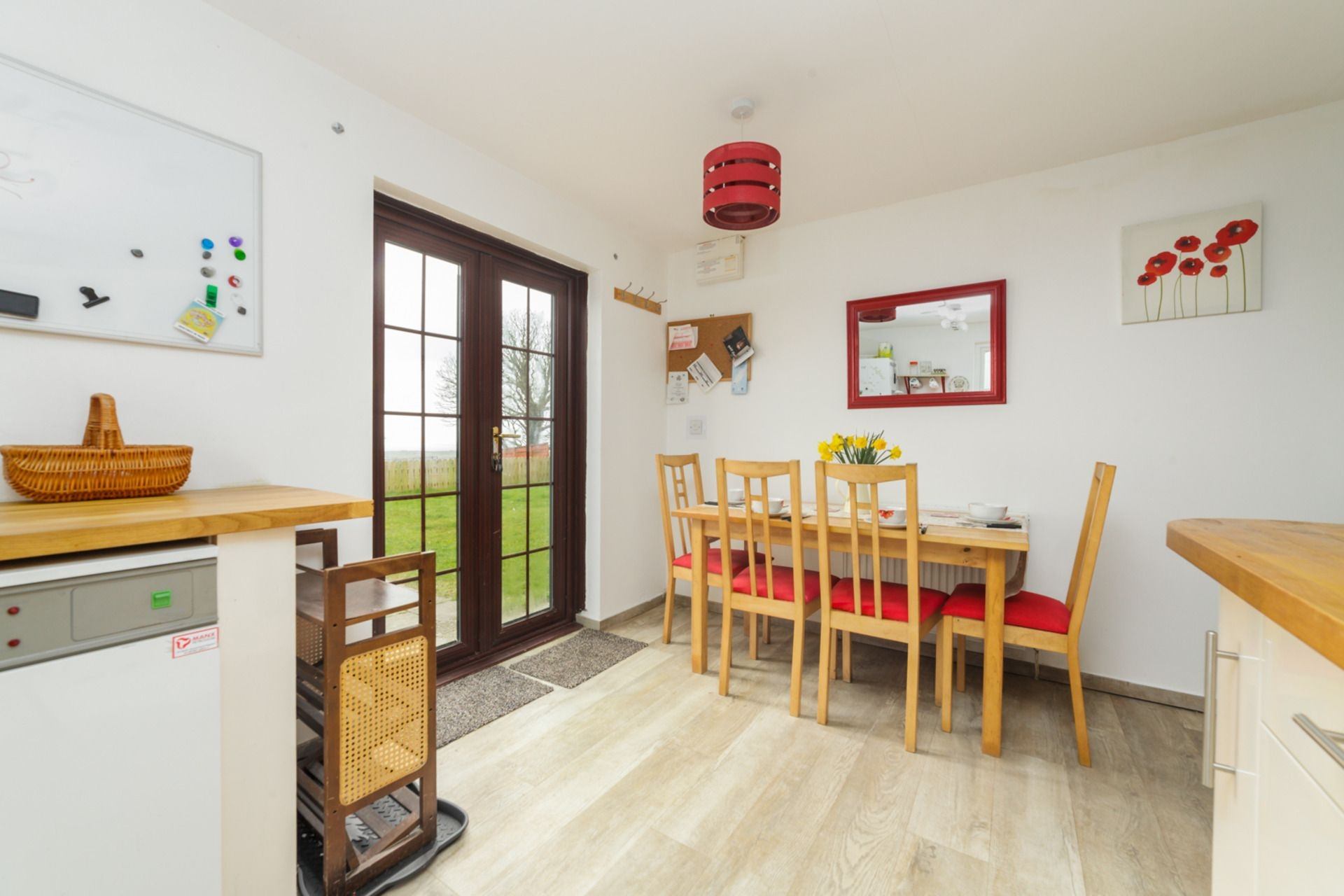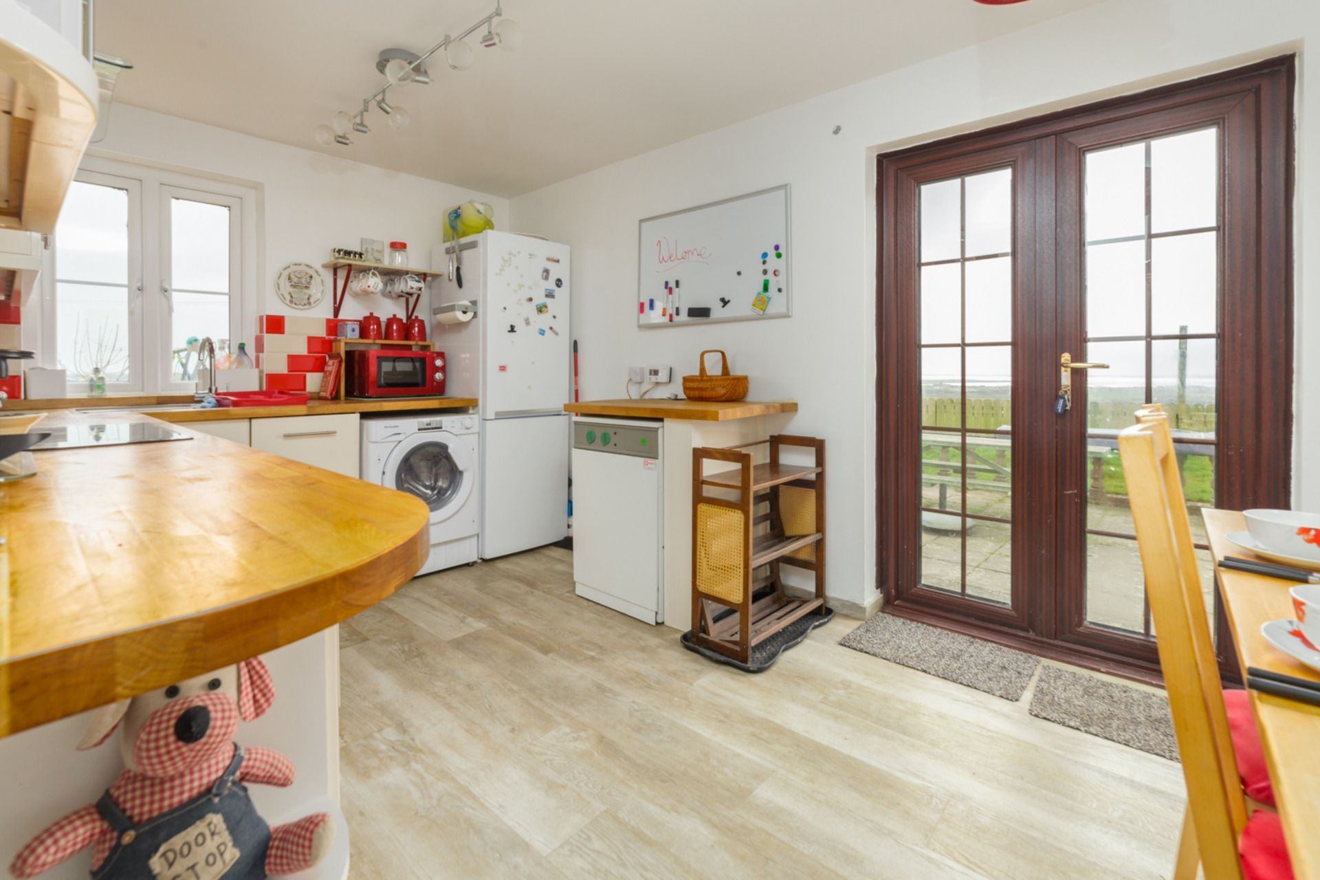 Kitchen / Dining area: Well-equipped, including hob, oven, washing / dryer, fridge / freezer and microwave. Dining table with four chairs is in the dining area, with views out of the French doors