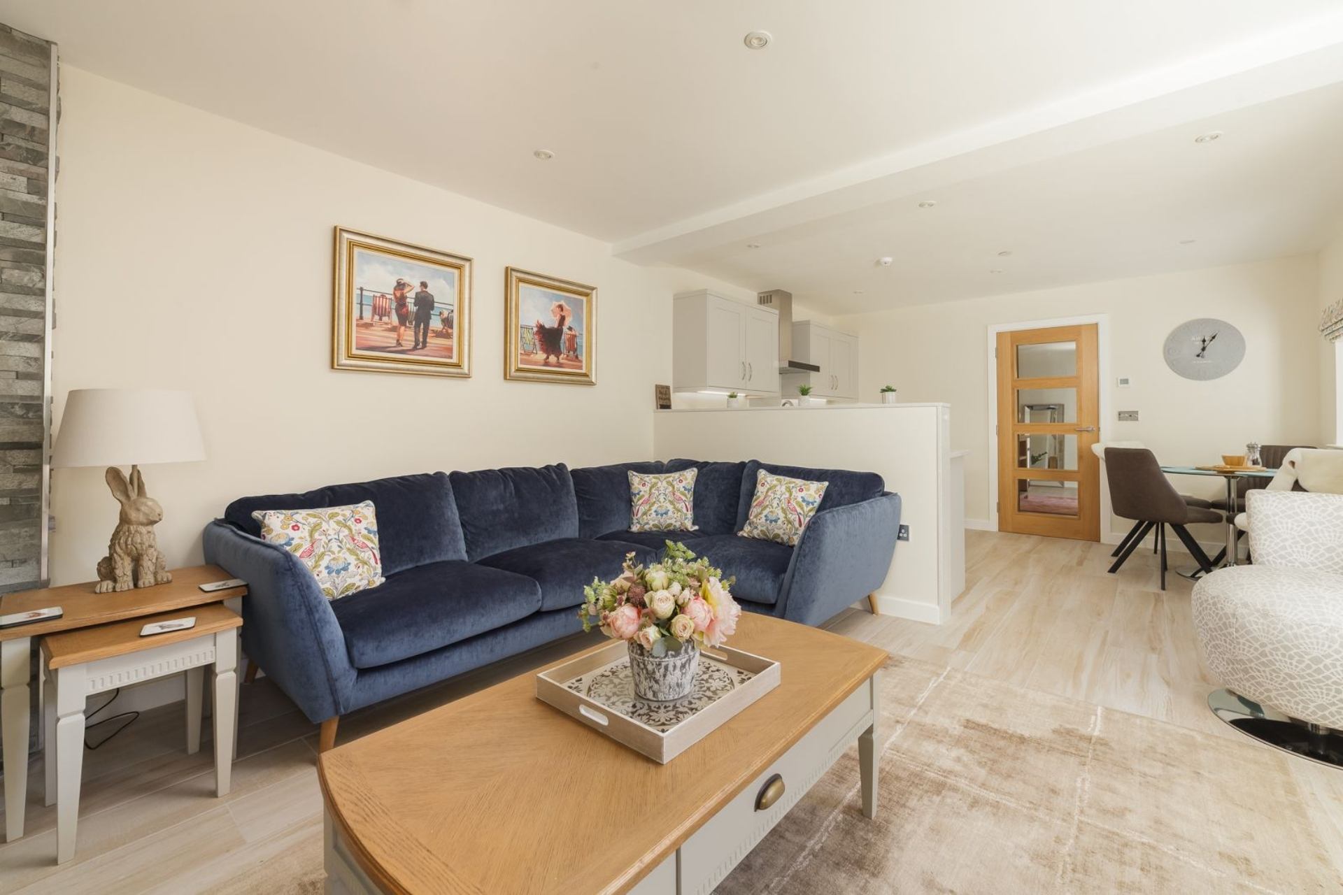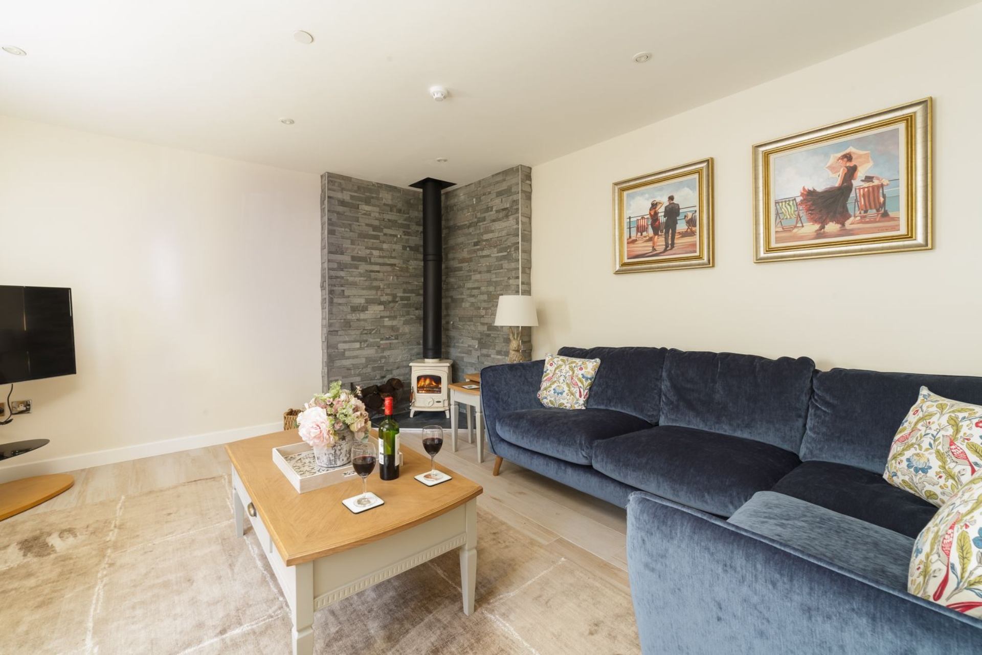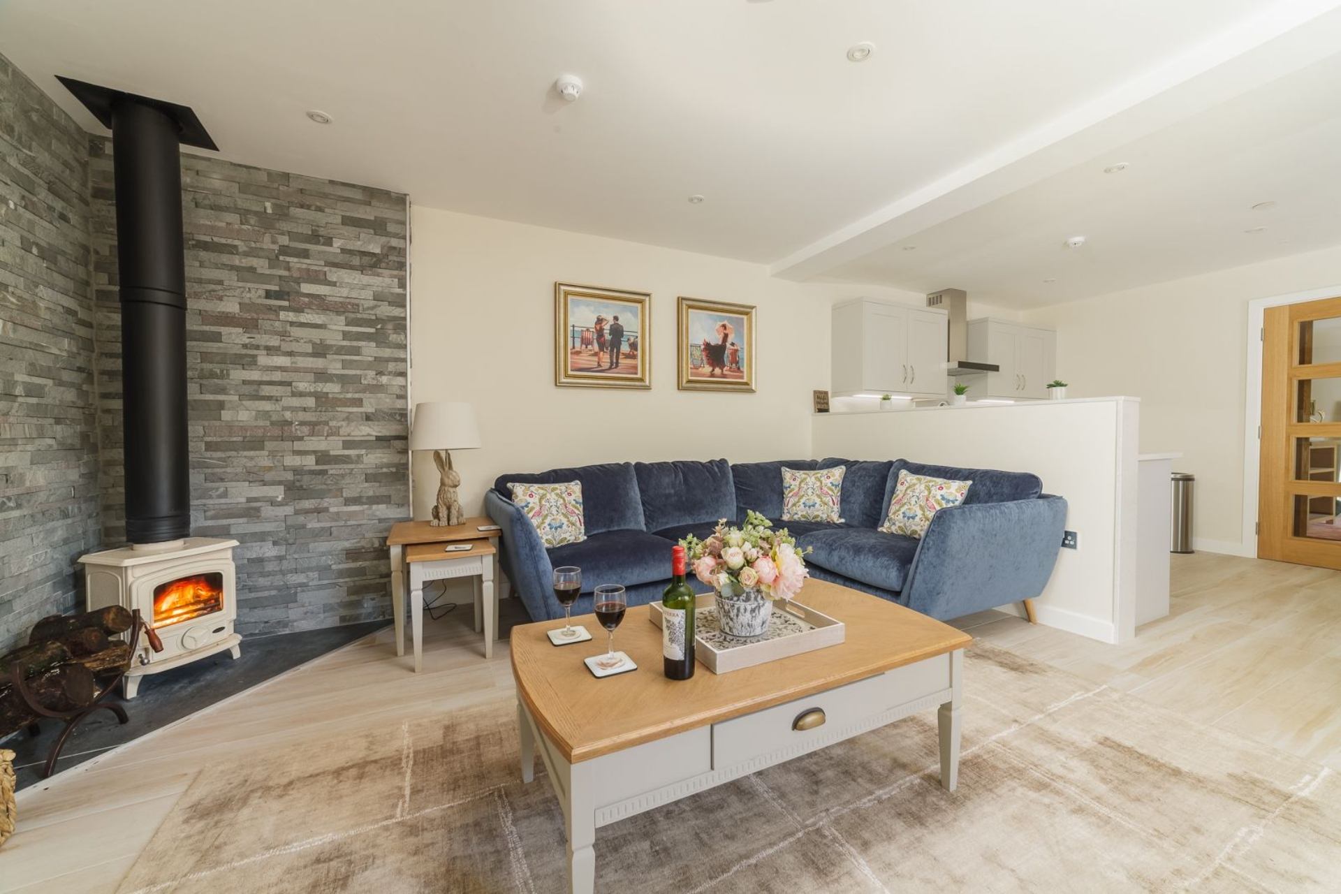 Lounge/Dining area: Log burner, corner sofa, coffee table, smart TV, Dining table with four chairs