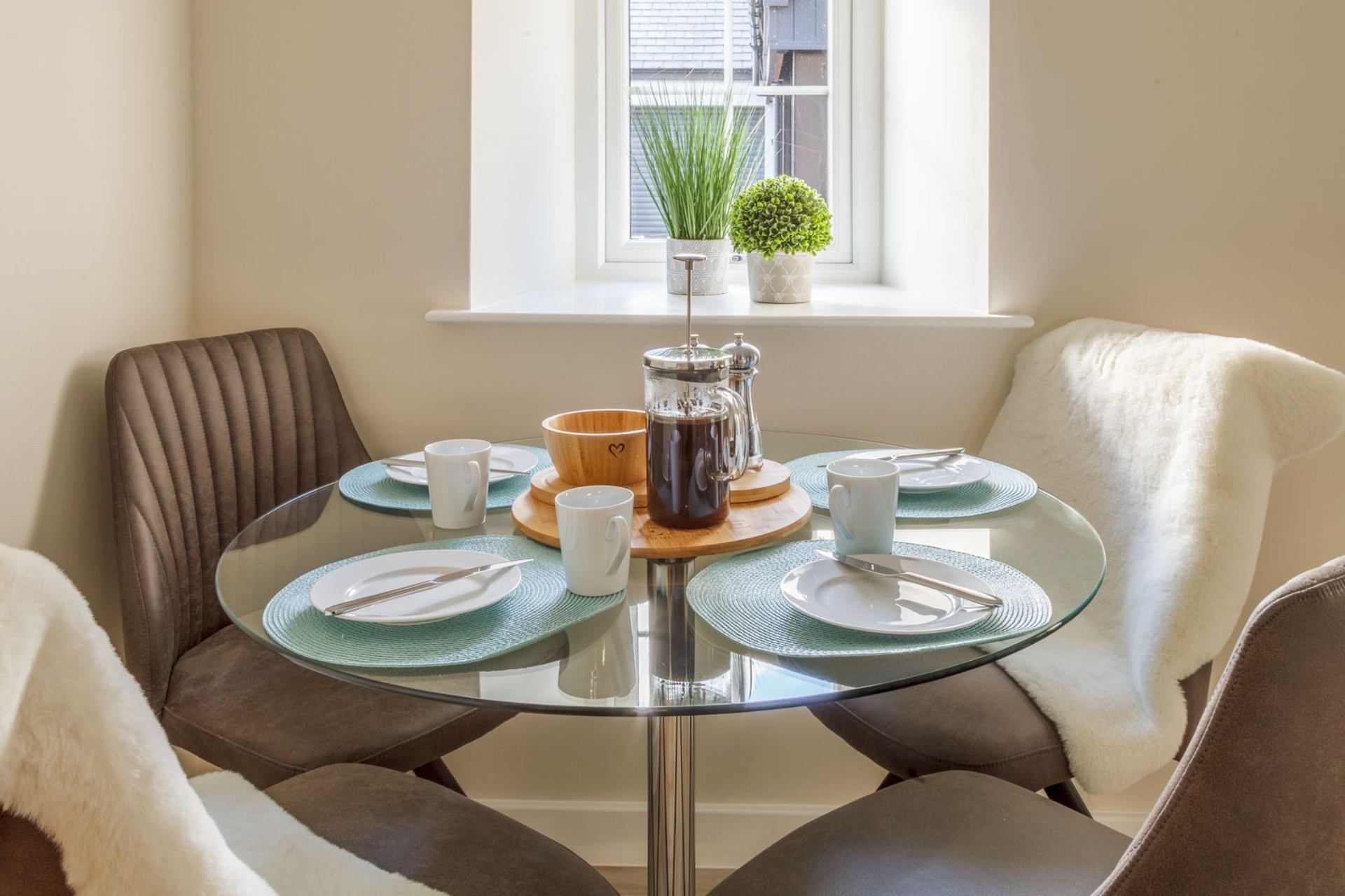 Very comfortable clean upmarket \nexcellent accommodation. Plenty of room for 4 people.On the plus side everything you need for a break is included ie bedding towels for 4 people,hairdryer, washer/dryer, dishwasher.All the kitchen utensils you need as well\n\nVery spacious master bedroom with lots of storage and coat hangers in both bedrooms.Large bathroom with lovely shower.\n \nHaving previously stayed there however we were disappointed to notice alot more scuffing generally on the walls.Entrance lighting would be a good idea as it is so dark and a car is definitely needed. In bedroom 2 the blind was broken and we had to jam a piece of card in the runner.The handyman came the next day but it could not be fixed during our Stay. This issue should have been dealt with before our arrival. Without being able to jam the blind with a piece of card the room would have been unsleepable due to the light.