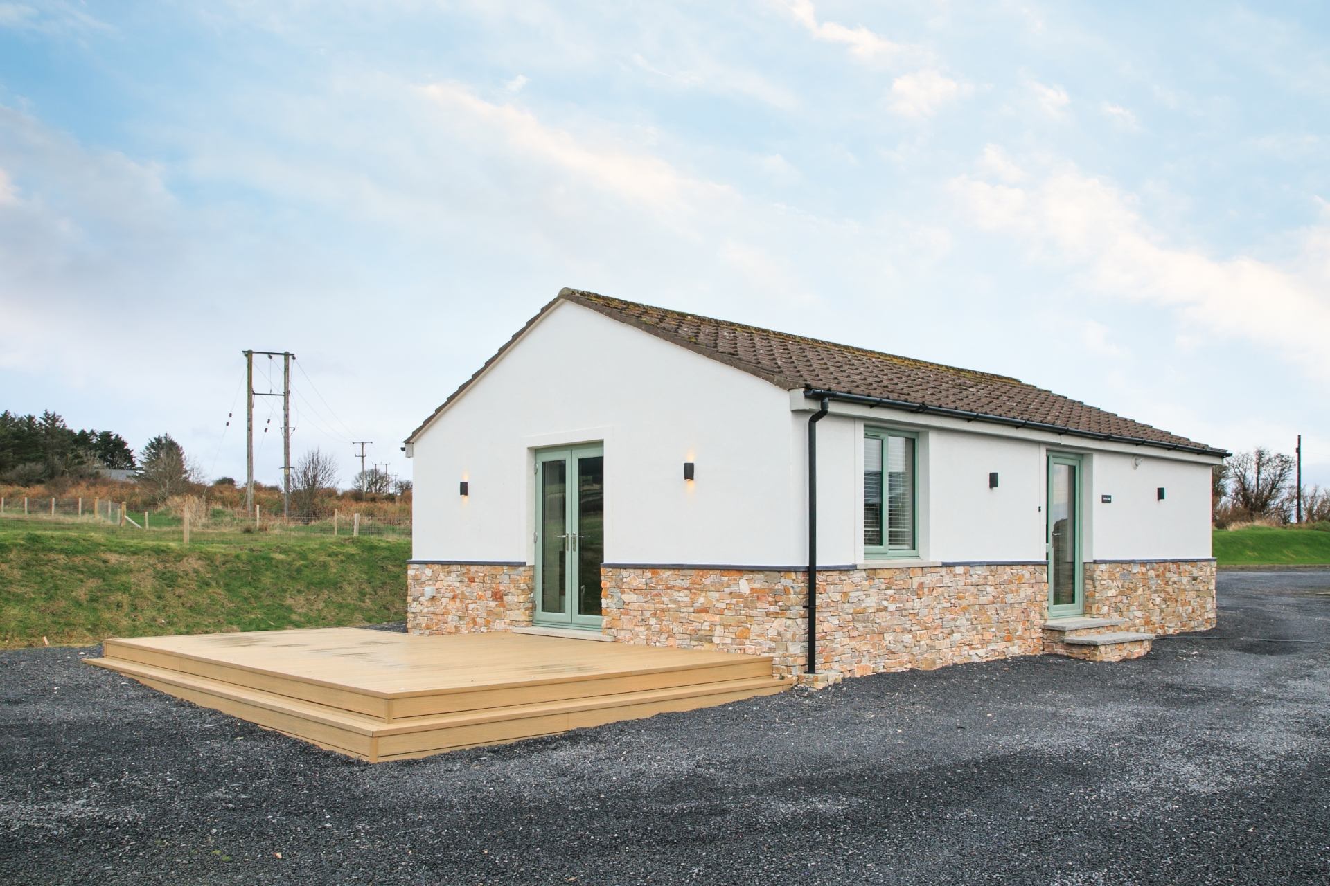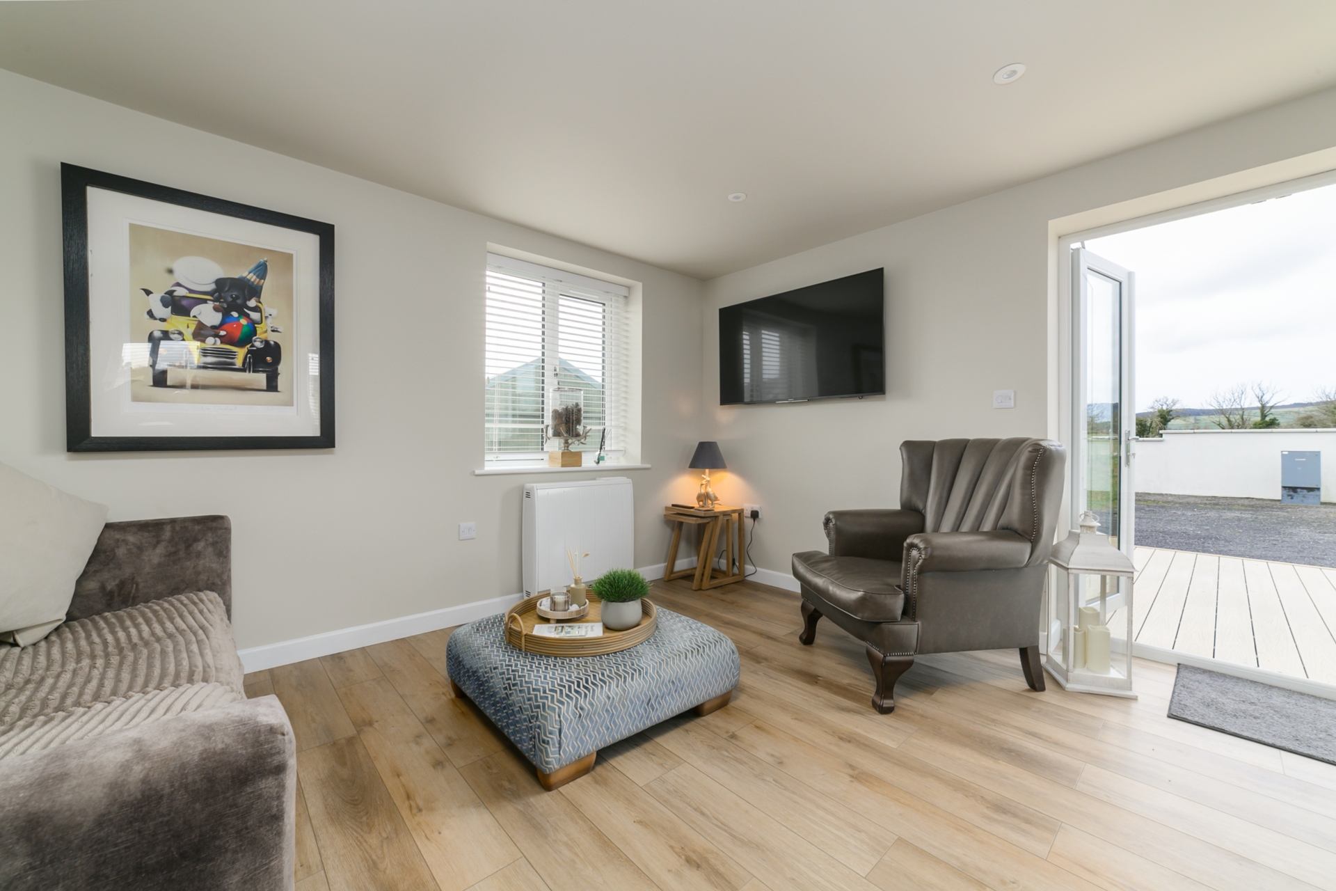 The accommodation is arranged over a single level and features a spacious open-plan living area with clean architectural lines and an abundance of natural light. The bedroom benefits from a private en-suite shower room, creating a boutique, hotel-style feel ideal for couples seeking a relaxed getaway.