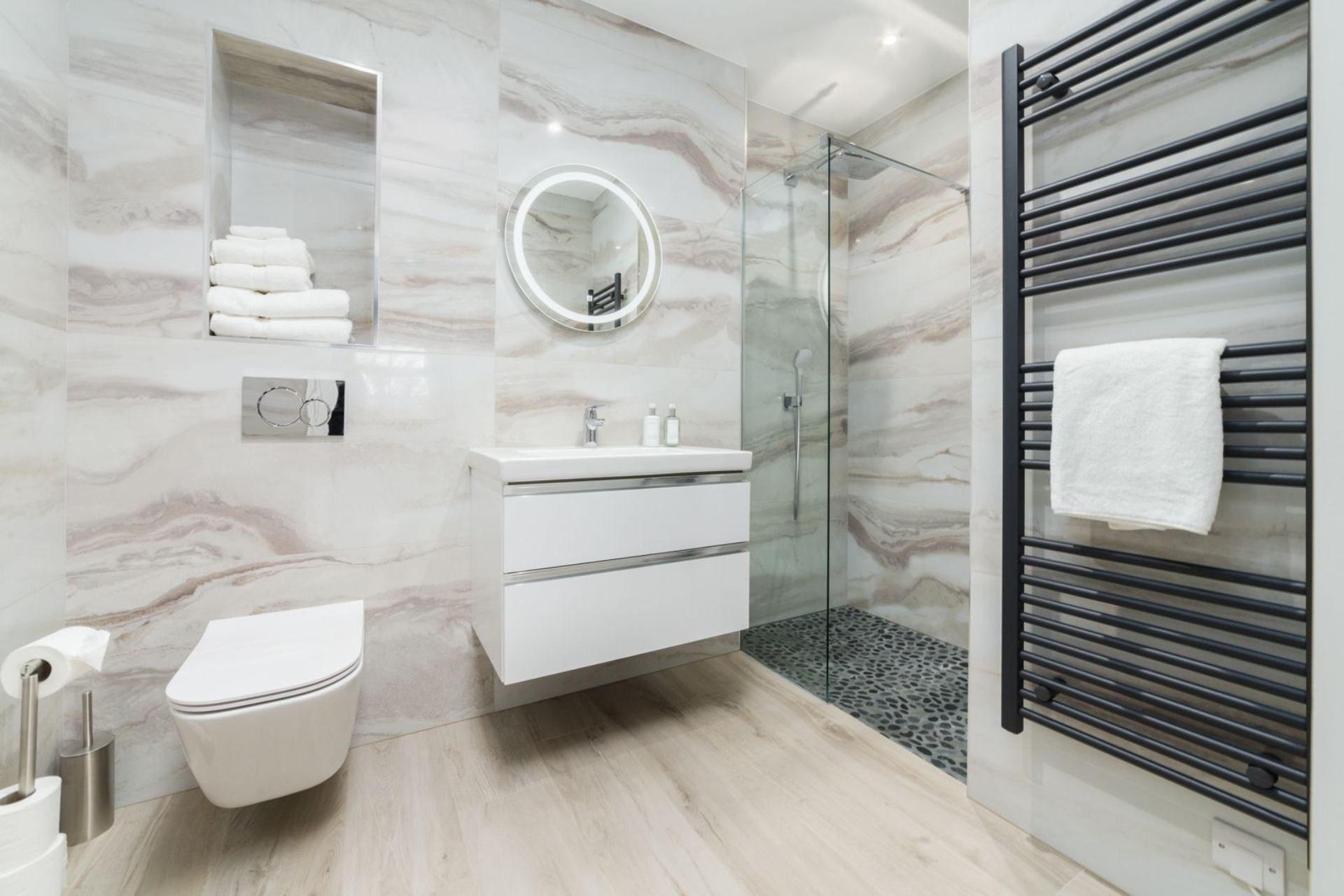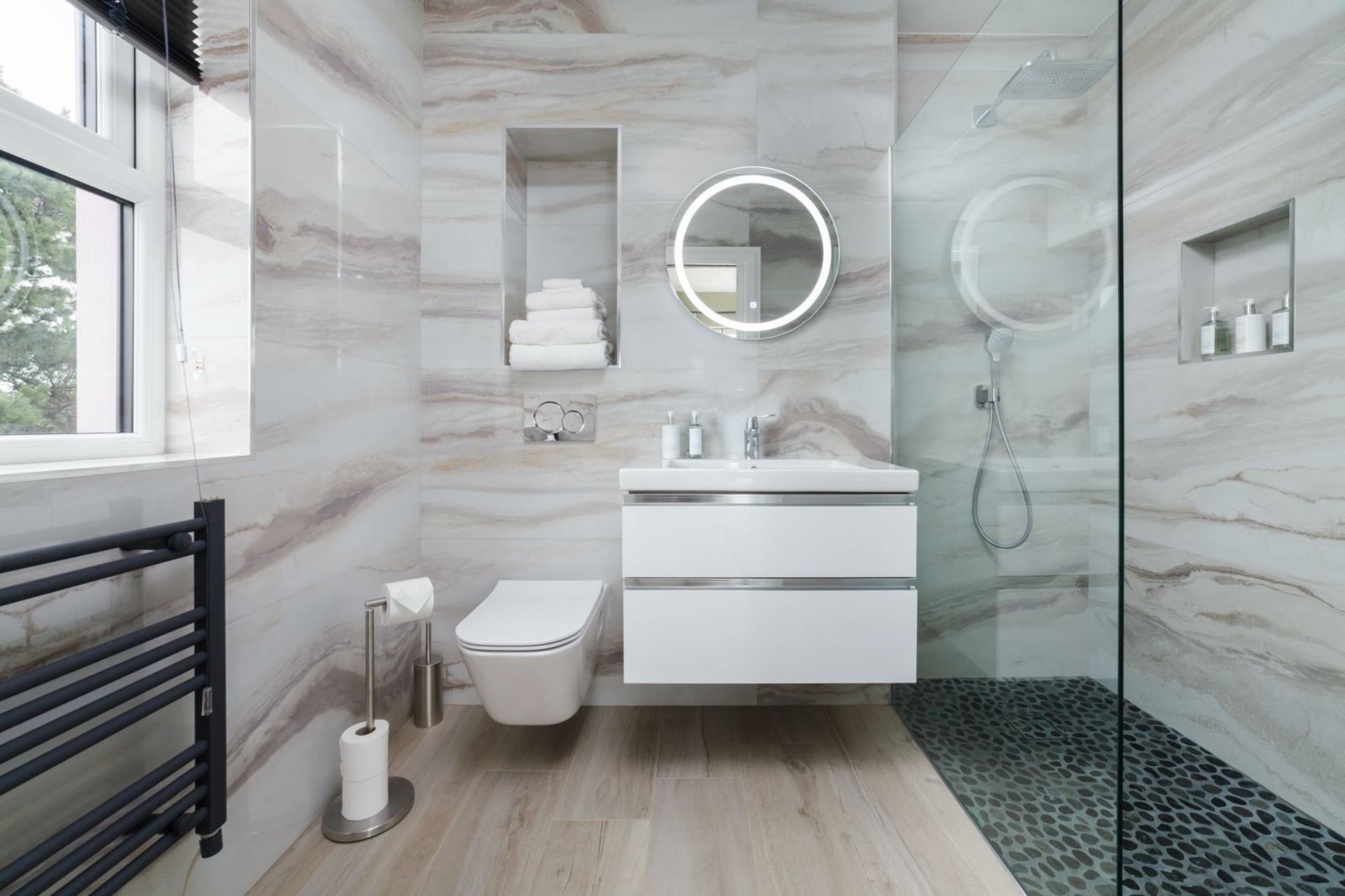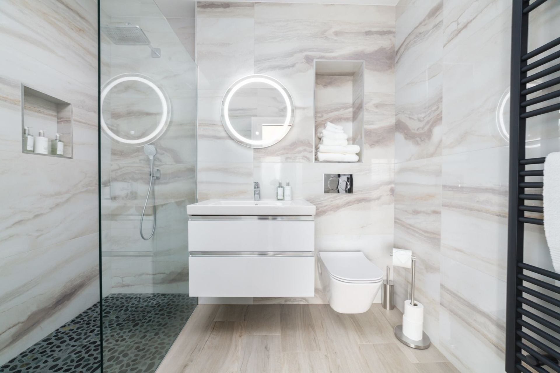 En-suite: Walk-in shower, WC, heated towel rails and wash hand basin.