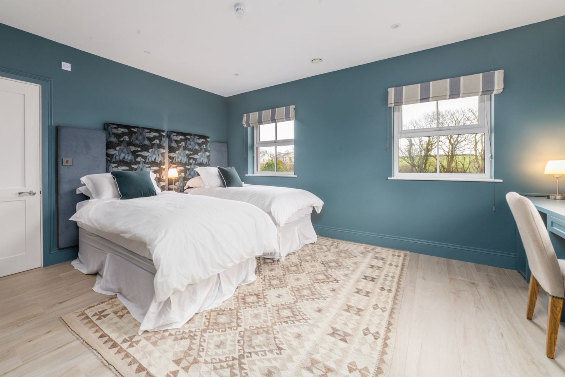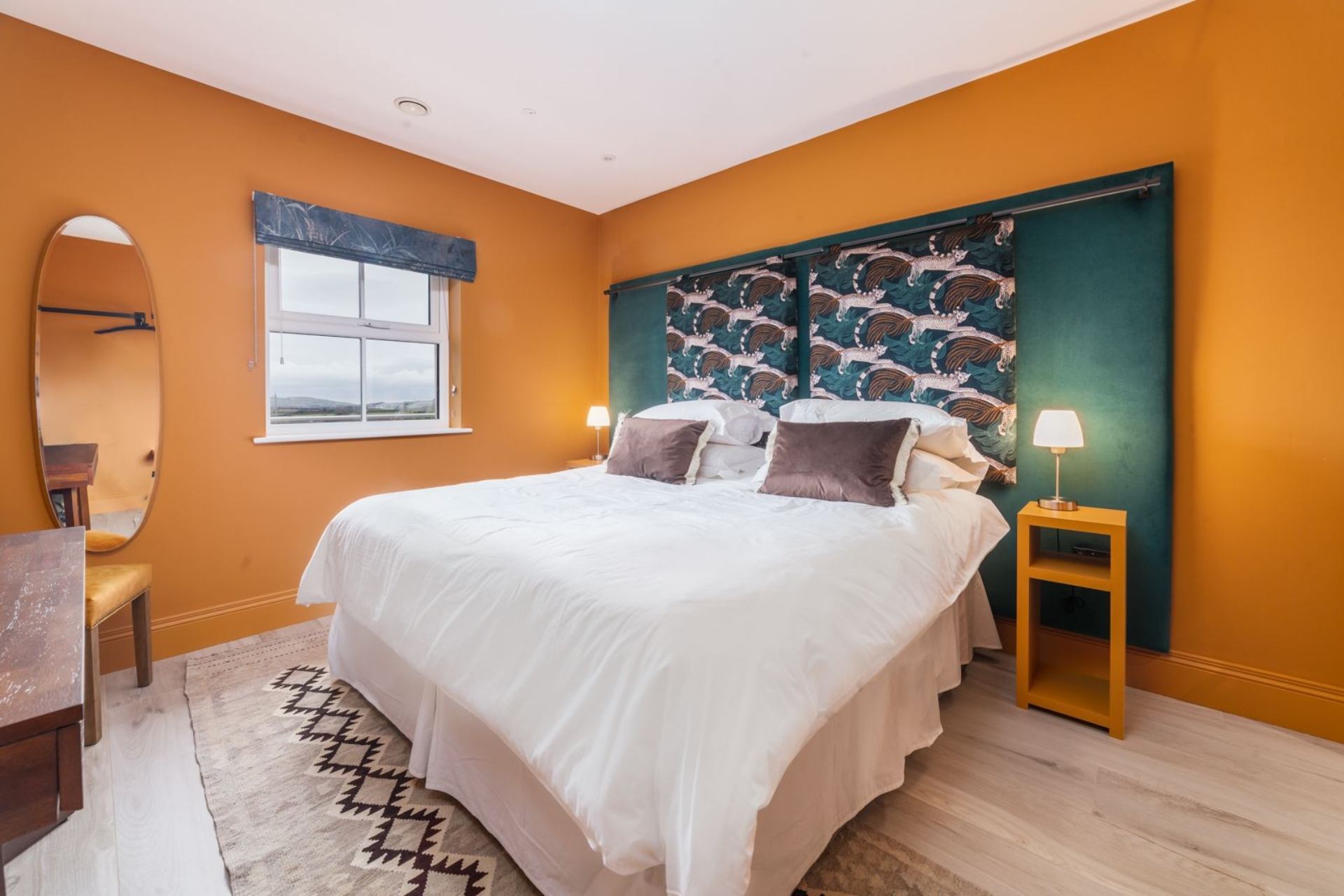 Bedroom 5: Super king size bed (can be configured as twin beds on request), bedside tables, contemporary hanging space, desk, mirror.