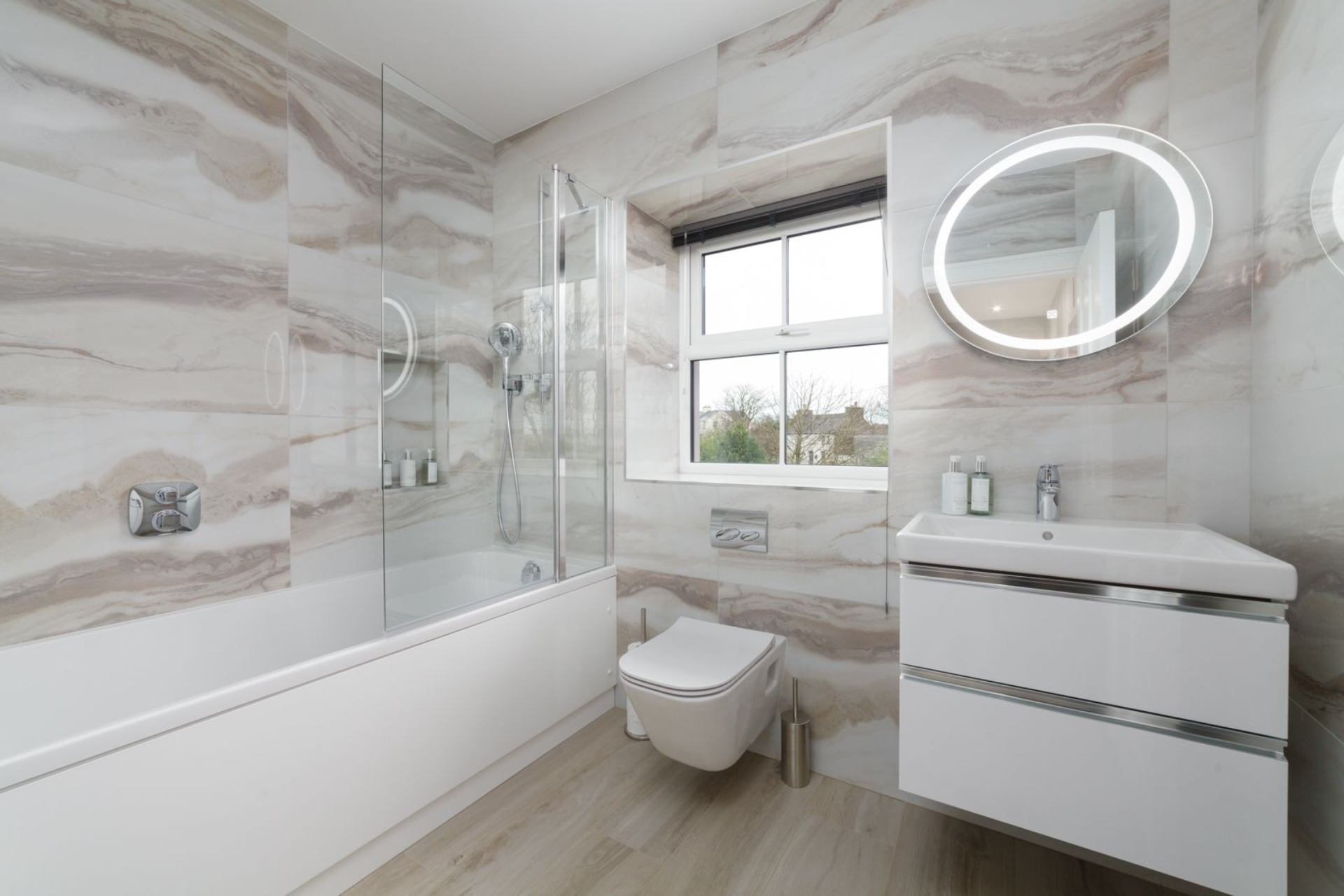 Family Bathroom: Bath, shower, WC, heated towel rails and wash hand basin.