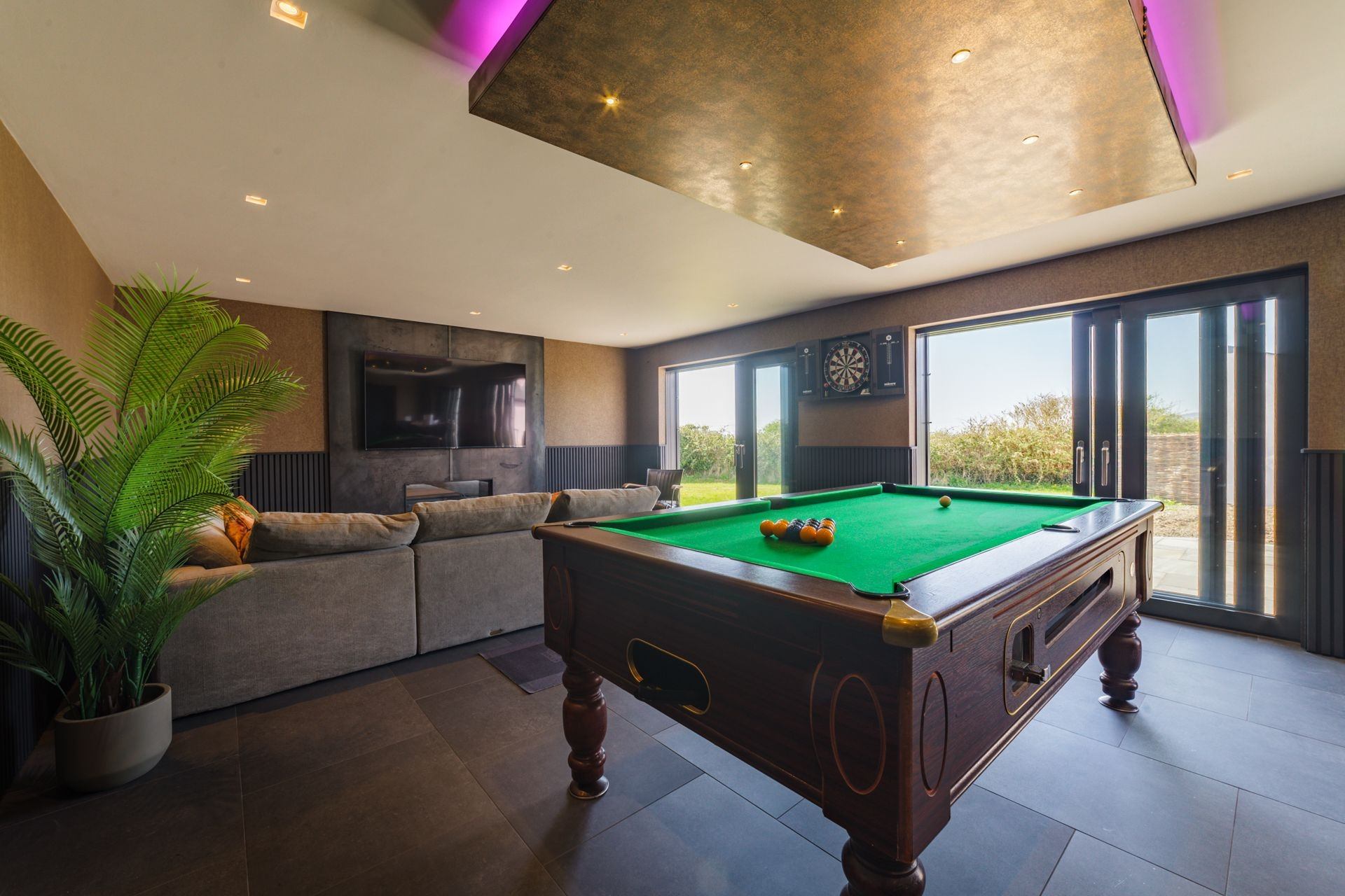 Step outside and immerse yourself in the stunning surroundings. Unwind in the outdoor hot tub, perfectly positioned to take in expansive views across the southern countryside. For those seeking entertainment, the private games room - complete with a bar, pool table, and TV - provides the ideal space to gather and enjoy.