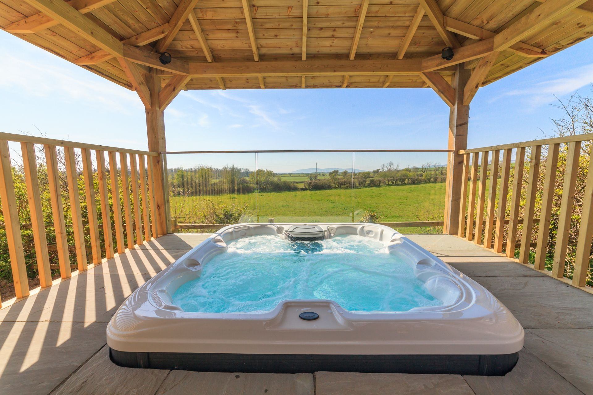 Hot tub: Elevated, covered and well-lit so you can enjoy views of the country-side and out towards Gansey. The hot tub also has Bluetooth speaker connectivity so you can enjoy your favourite playlist or podcast whilst relaxing. There is an outside shower adjoining the decking so you can wash pre and post hot tub.