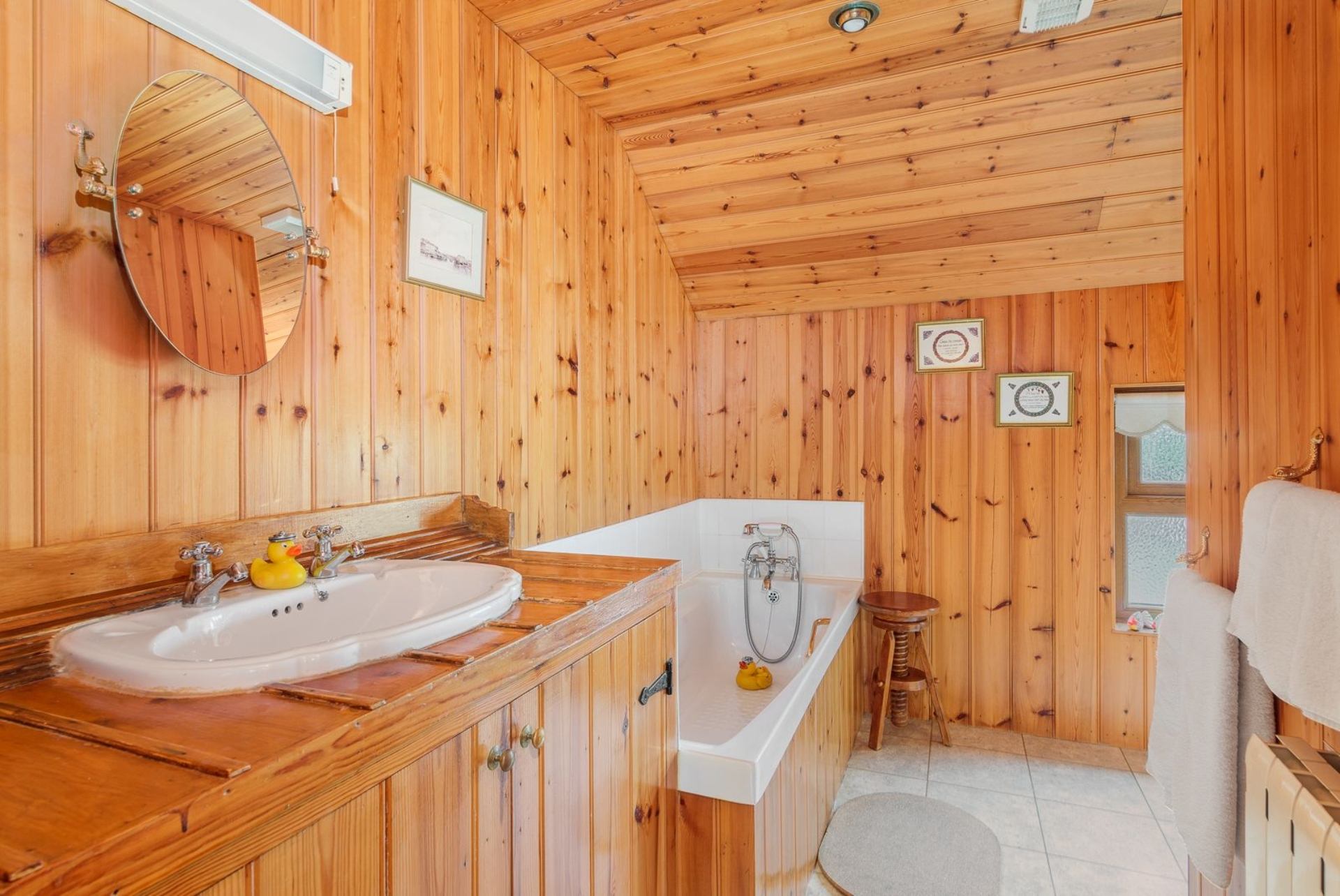 Bathroom: Bath with handheld shower, WC and wash hand basin.