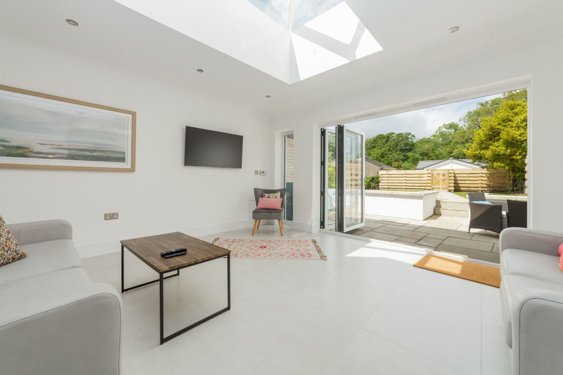 Living Area: Two comfortable sofas and two armchairs to seat 8 people, Smart TV and bi-fold door access to landscaped garden and patio.