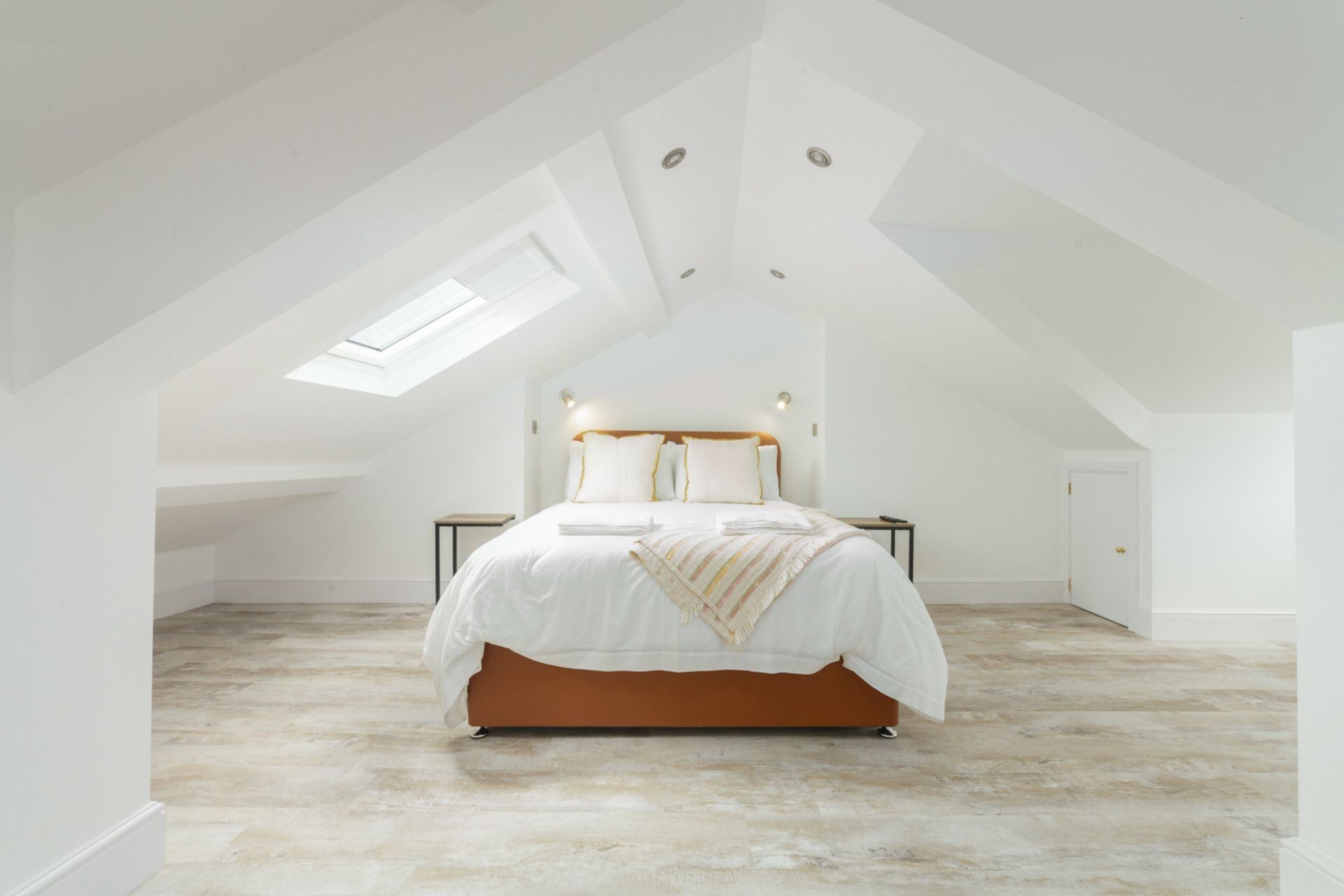 Bedroom 3: Attic bedroom containing king size bed, Smart TV, occasional chair and hanging space.