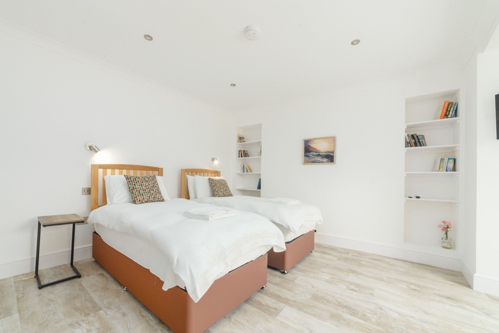 Bedroom 2: Super king beds that can be configured as a twin on request, Smart TV, occasional chair and hanging space.
