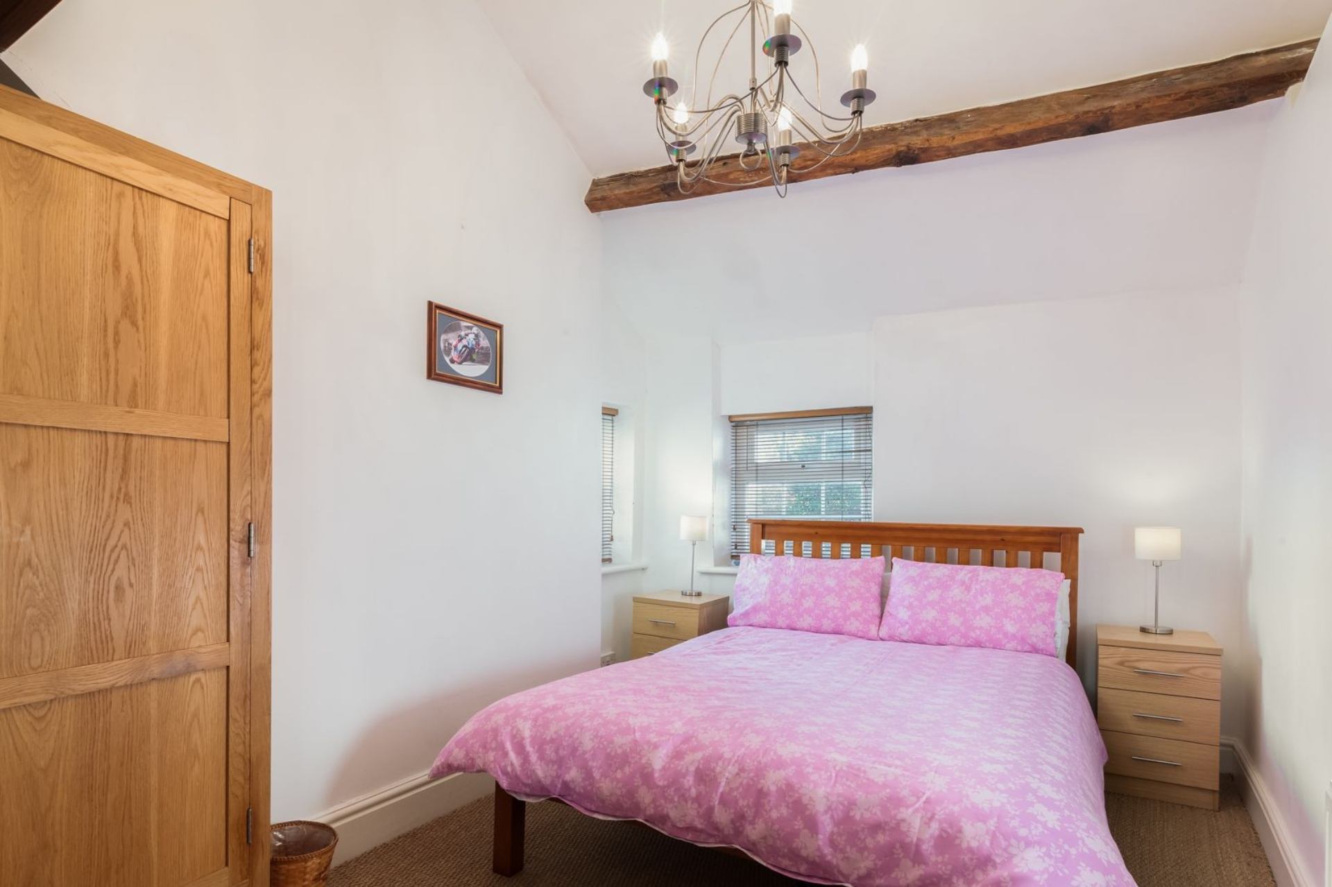 Bedroom: Double bed, wardrobe, two bedside cabinets with 3 drawers.