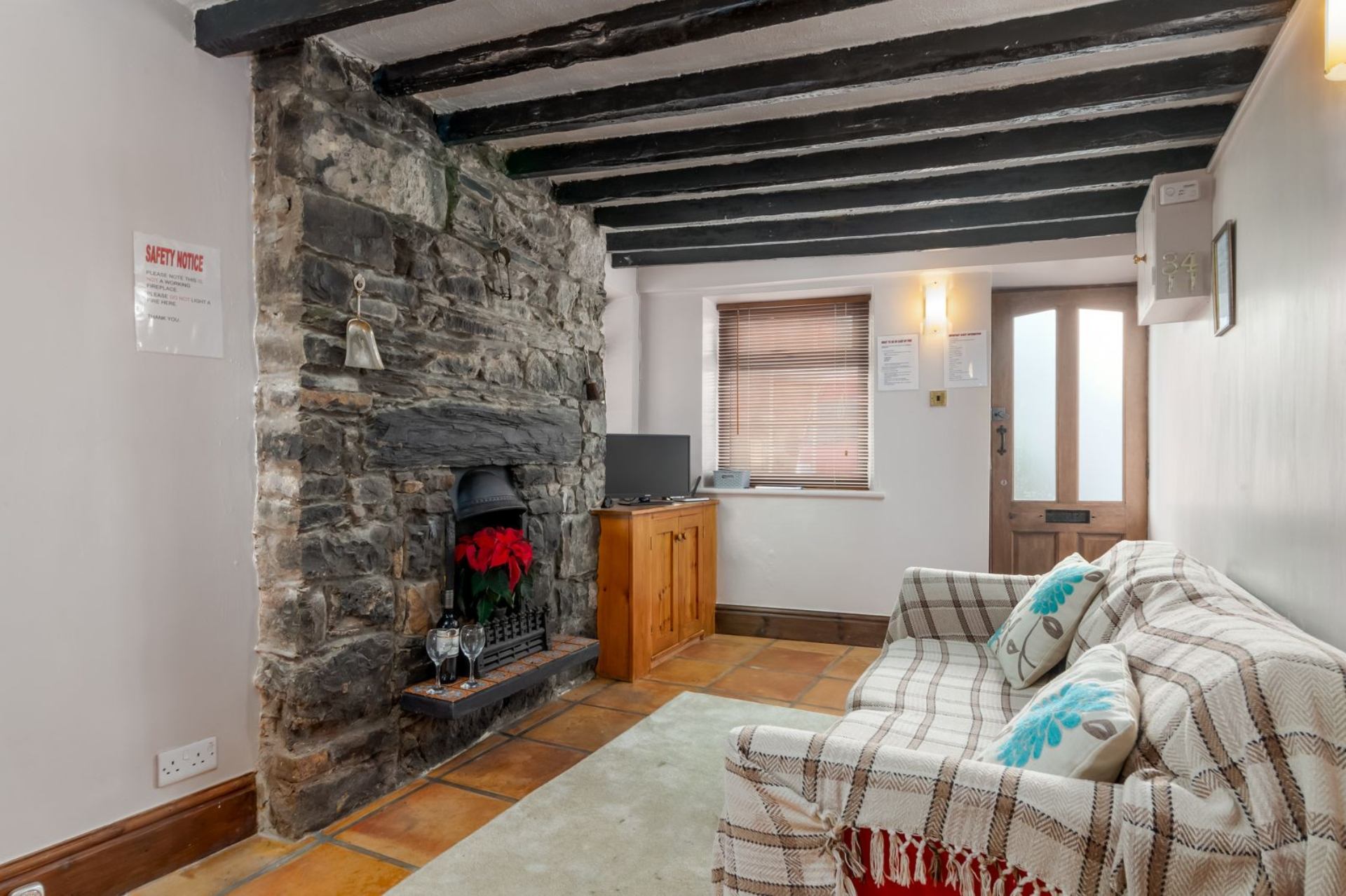 Great location. \nFlaky peeling paint on walls. \nLumpy pillows.\nBuildup of dust behind bedside table.\nFridge wobbly. \nComfy sofa.\nLovely fireplace.