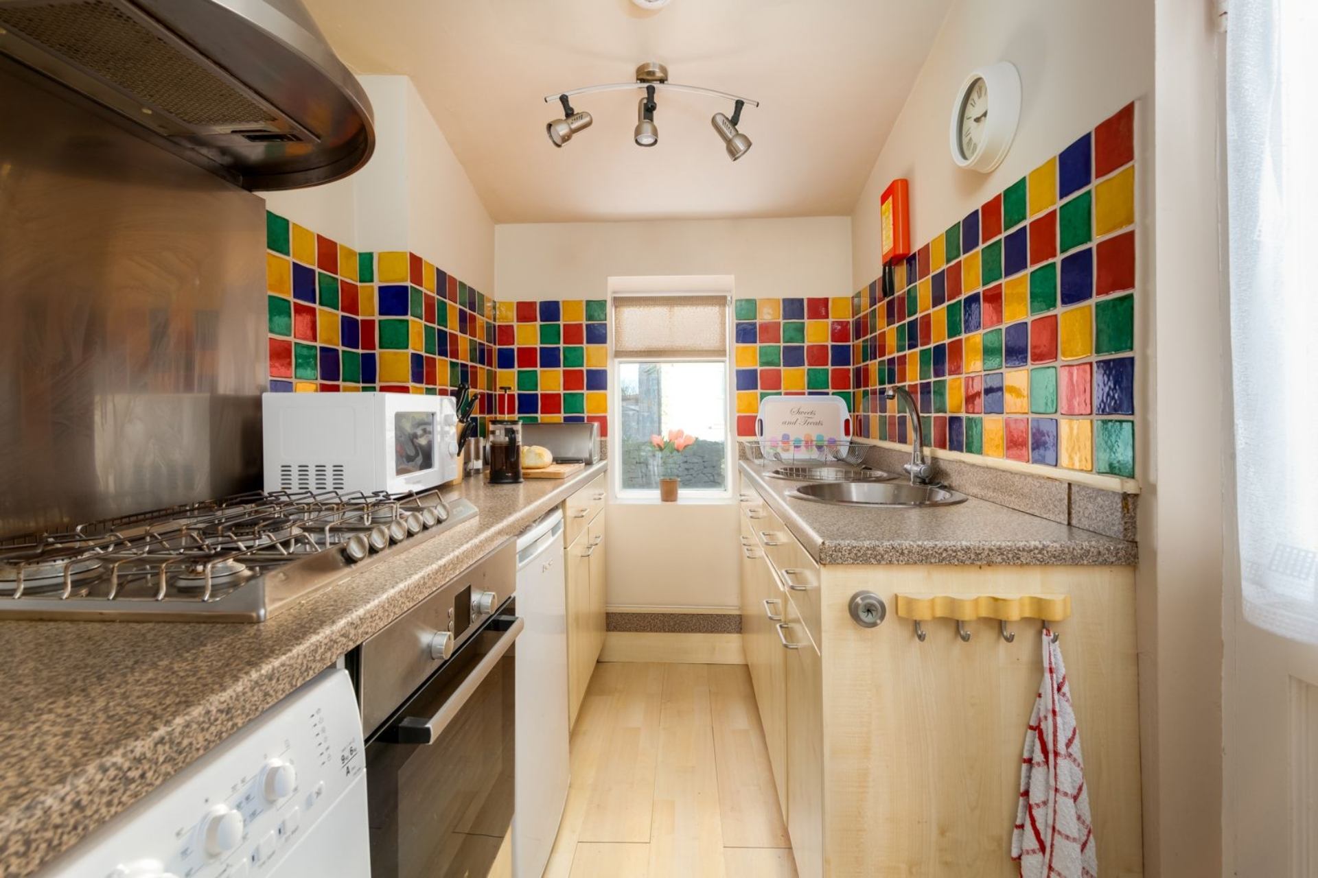 Kitchen: Fully equipped with gas hob, electric oven, microwave, washer/dryer, and fridge.