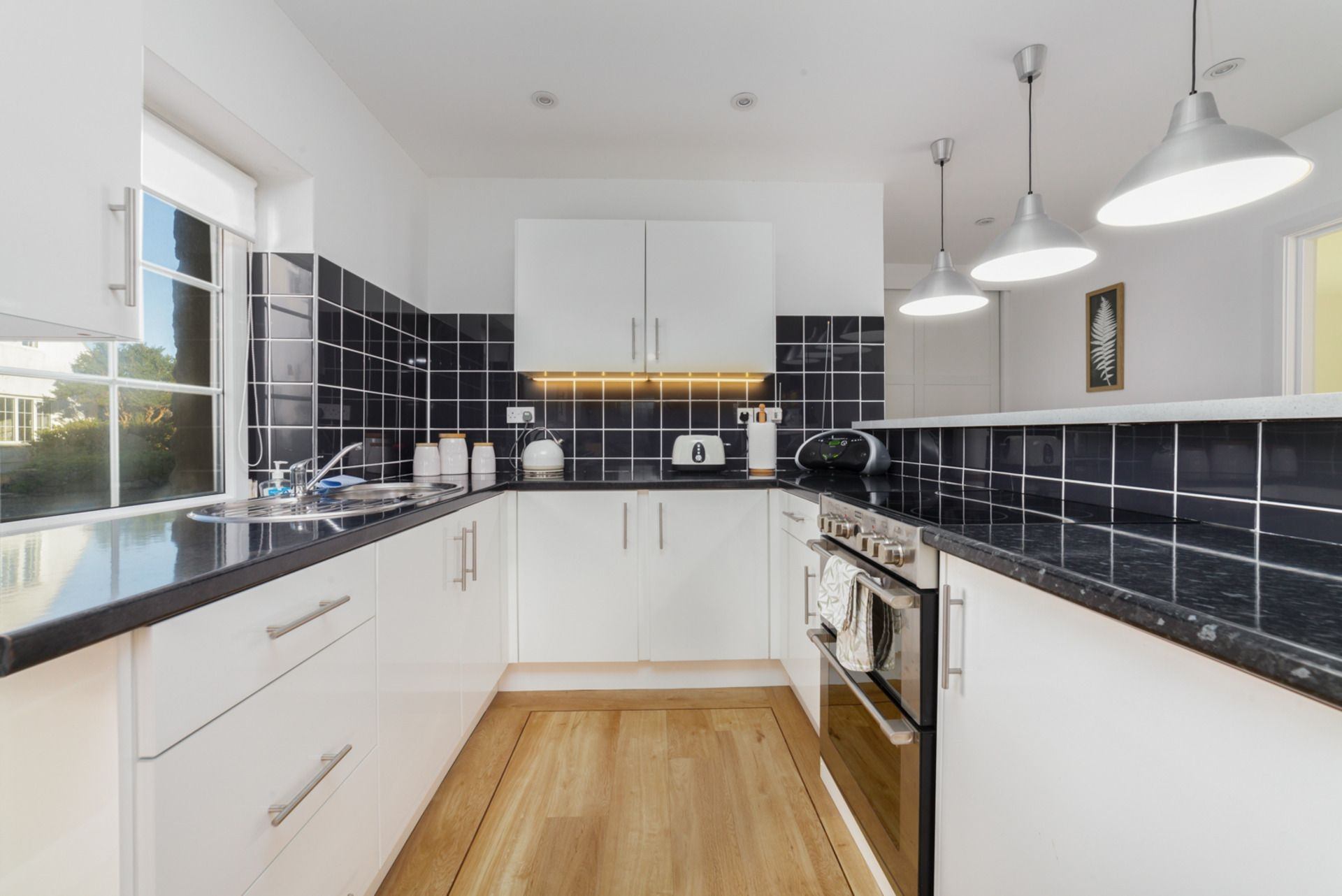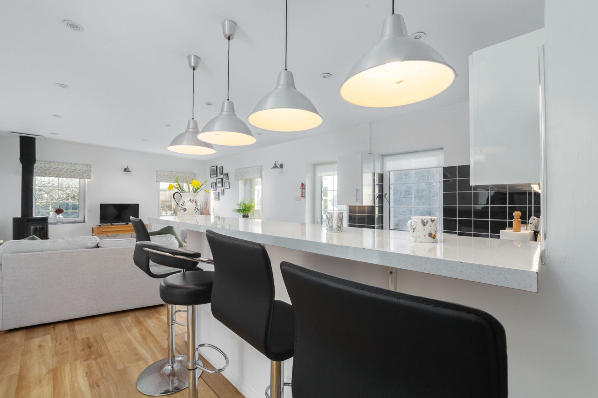 Kitchen: Fully equipped with ceramic hob, oven, microwave and fridge. Seating for 4 at raised counter.