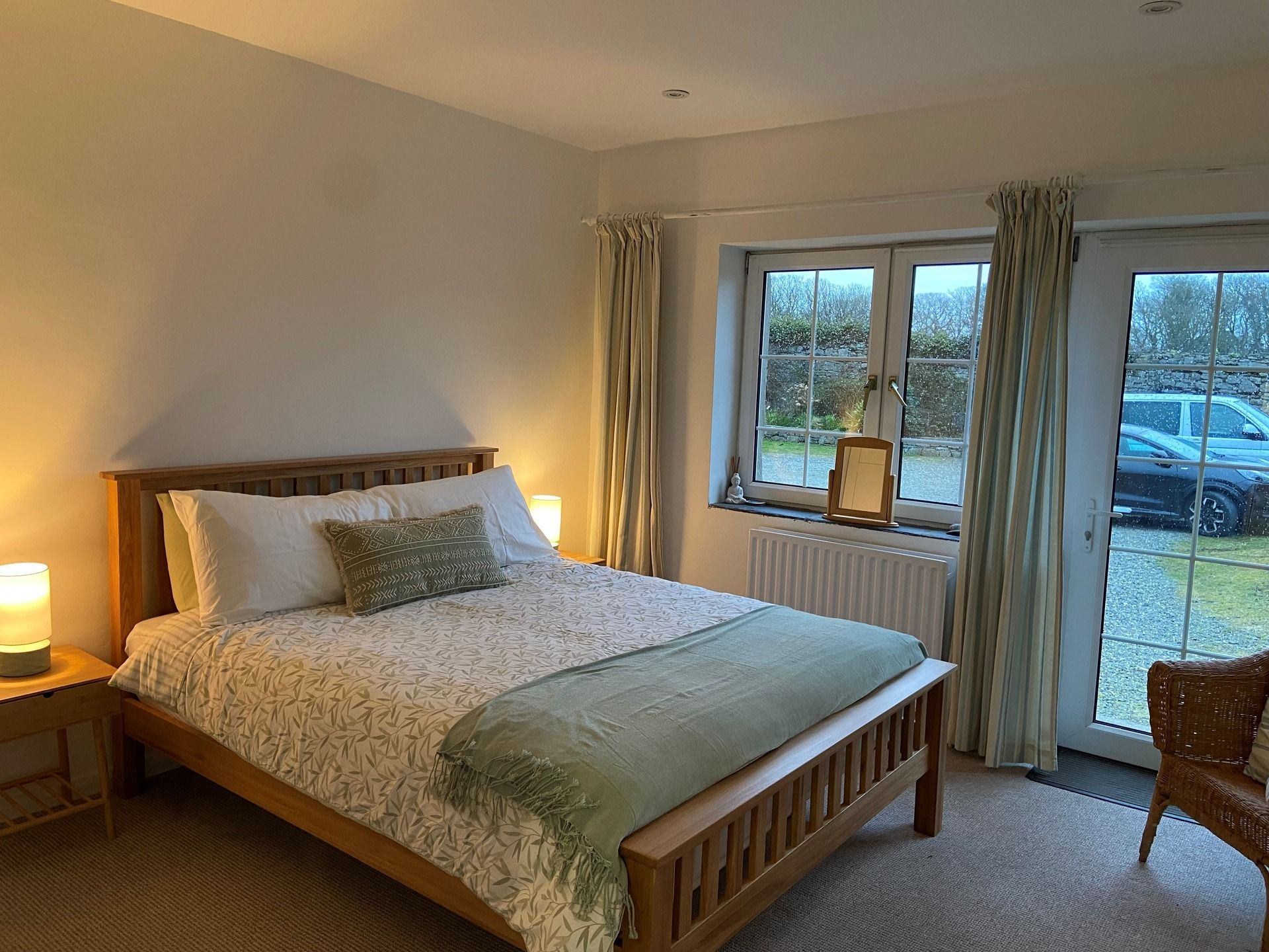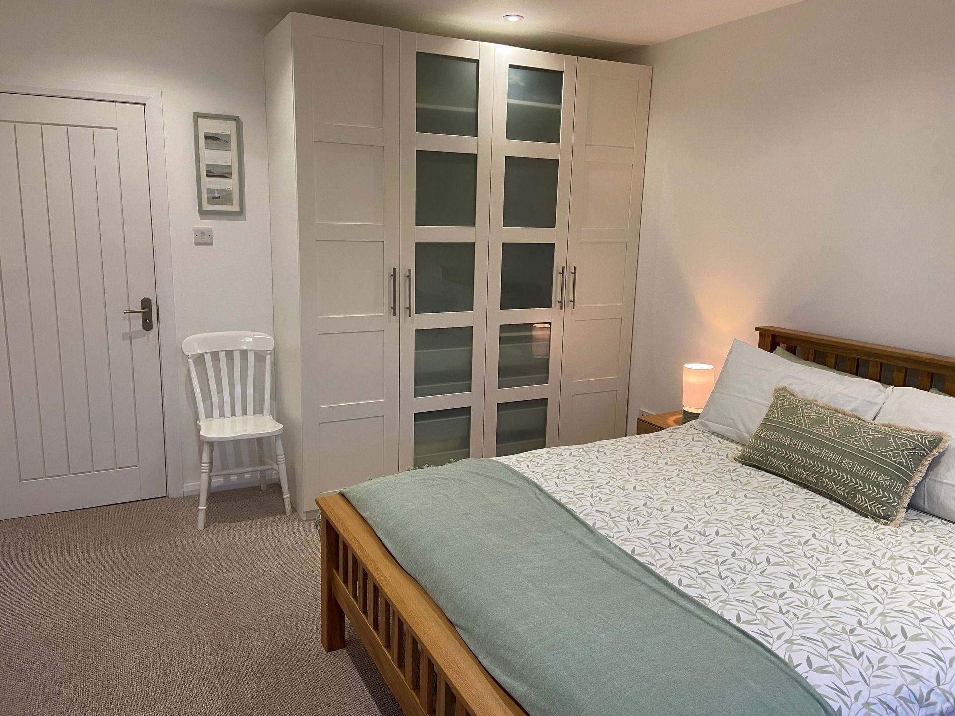 Bedroom: King size bed, wardrobe, bedside cabinets and access to parking area and rear of property.